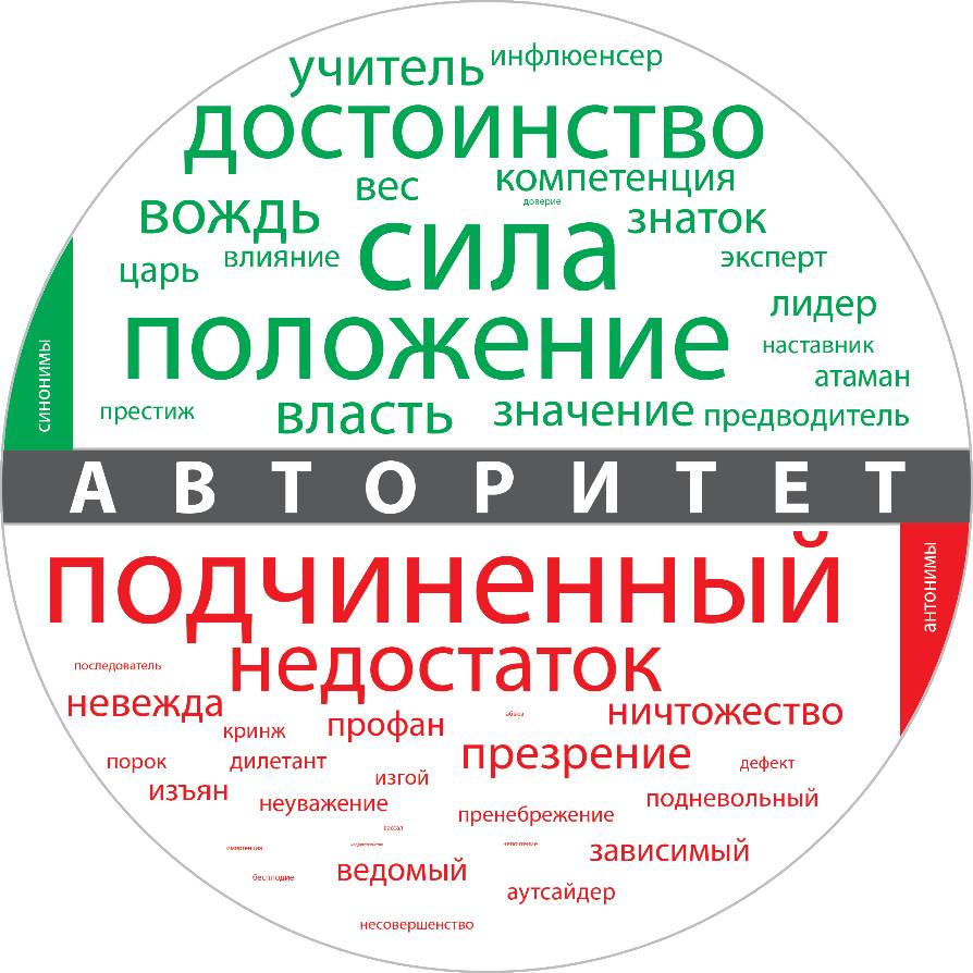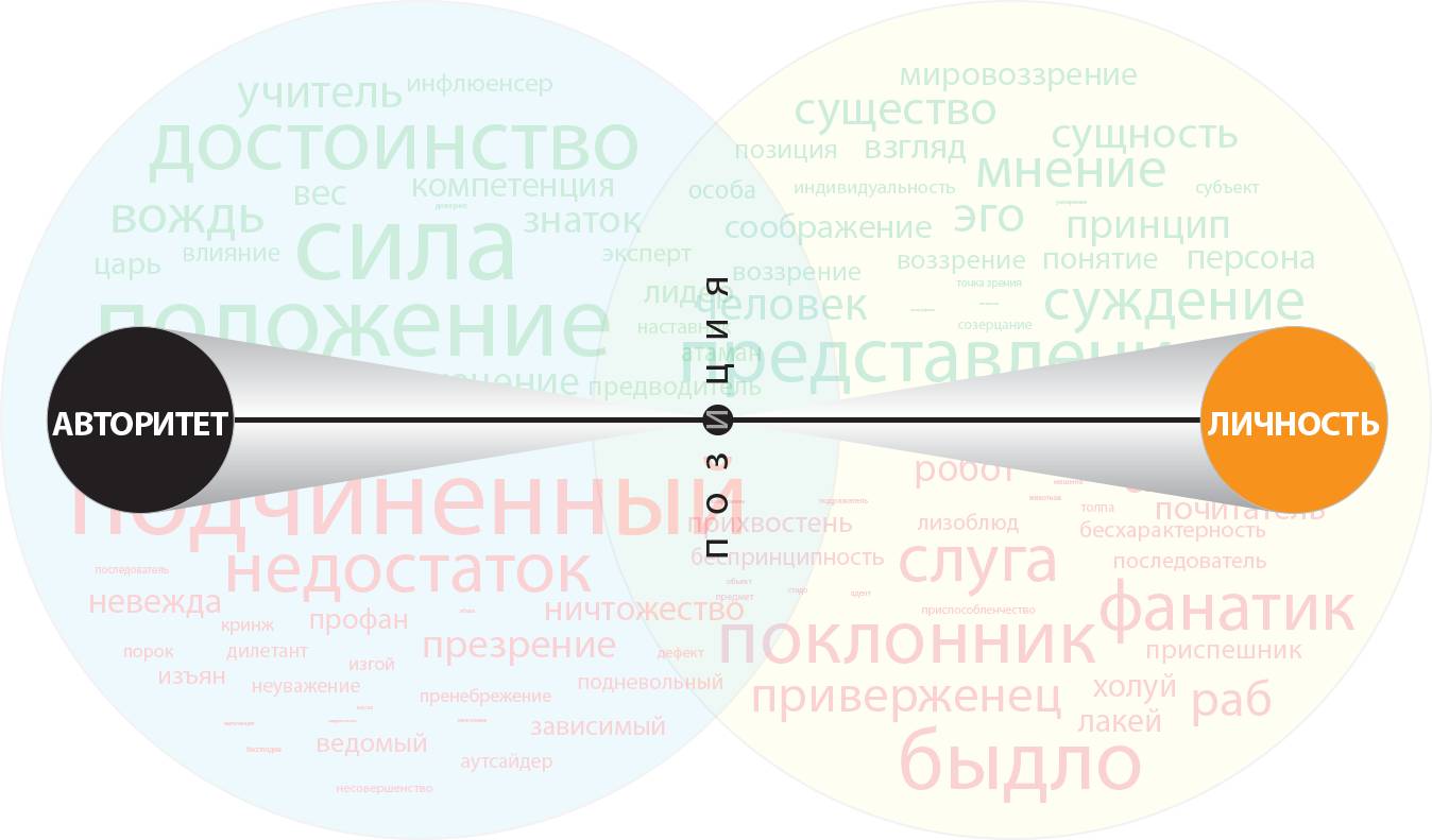 Удивительно, что теперь мы не видим ни одного пересечения ни в синонимах, ни в антонимах. Но это не повод отчаиваться, поскольку у нас сформировался набор синонимических понятий: суждение, мнение, воззрение и т.п., который можно сгруппировать в категорию Позиция, и уже ею оперировать как водоразделом между Я-Личностью и Авторитетом.