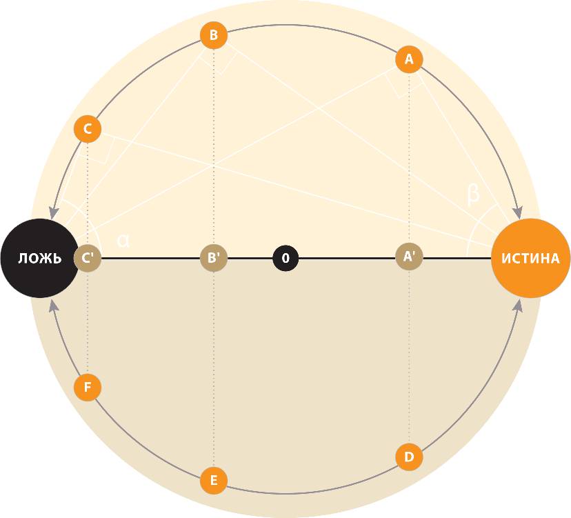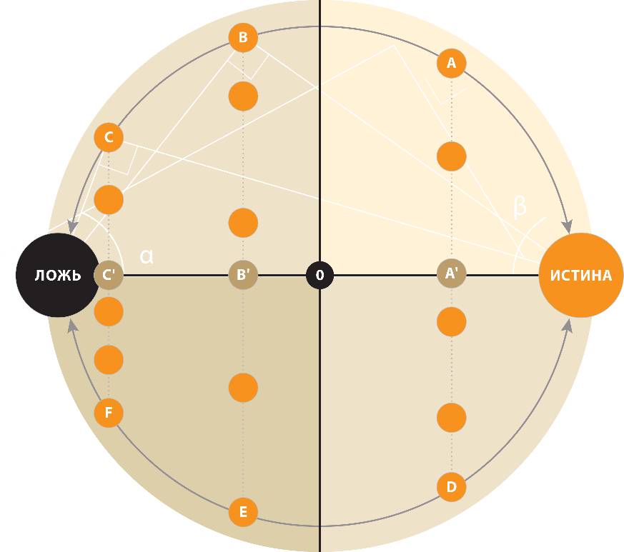 «Правда у каждого своя», – это высказывание хорошо иллюстрируется предыдущими схемами. Степень Правды может отличаться в зависимости от ее приближения к Истине, или Лжи. В свете проведенного беглого анализа можно сказать, что в любой Правде содержится как толика Истины, так и толика Лжи. Если Ложь перевешивает, как в точке 2 на отрезке бинарности, тогда это можно назвать Заблуждением, Ошибкой, Фальшью. Если перевешивает Истина, как в точке 1, то мы говорим об Открытии, Достижении, Понимании, Законе как факте и феномене. И только в срединной – нулевой – точке они полностью уравновешены: ни рыба ни мясо.