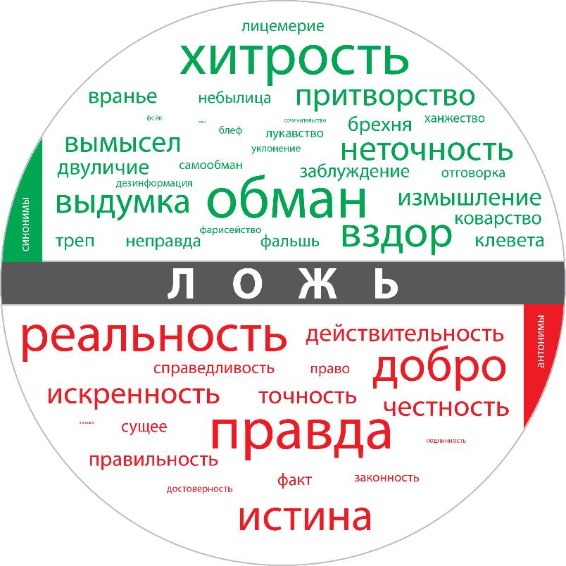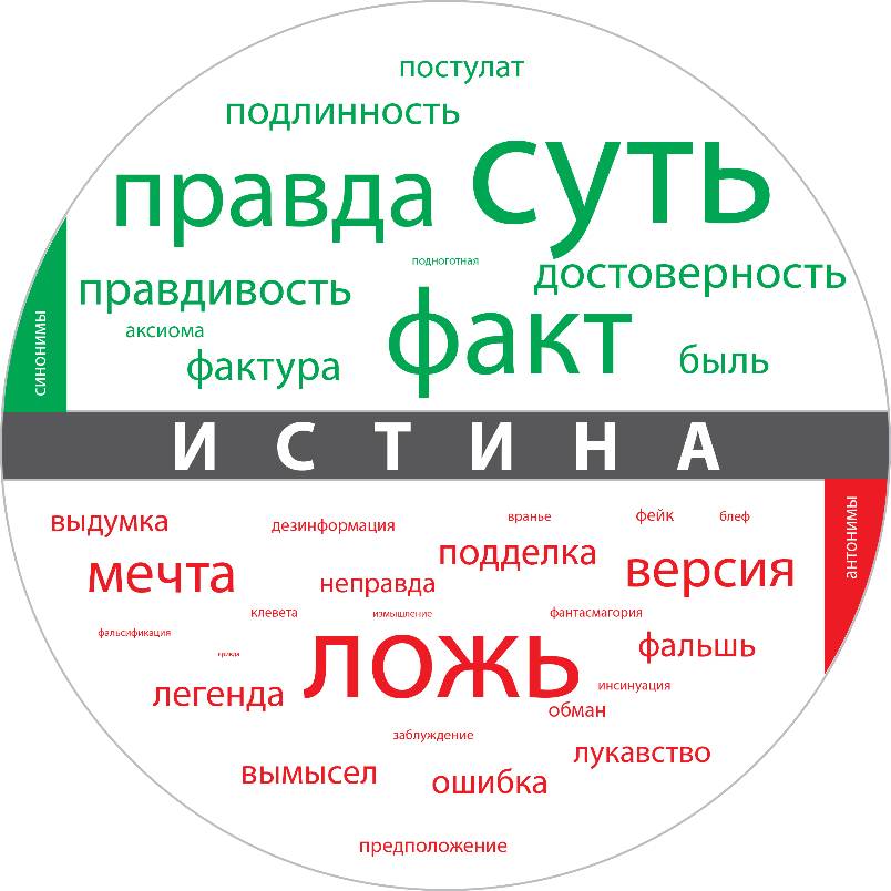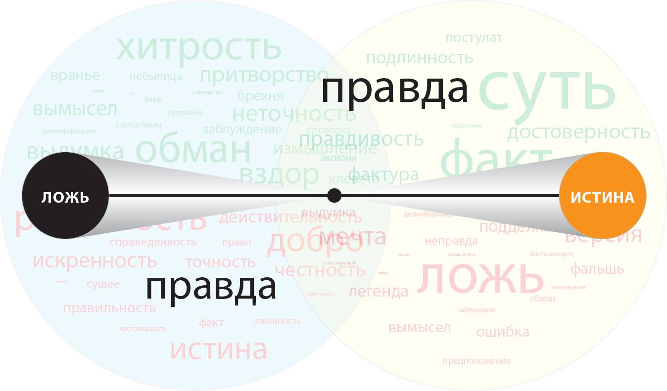 Из сравнения синонимов Истины и антонимов Лжи мы можем легко выделить Правду как некое переходное понятие, находящееся в зоне пересечения смысловых облаков.