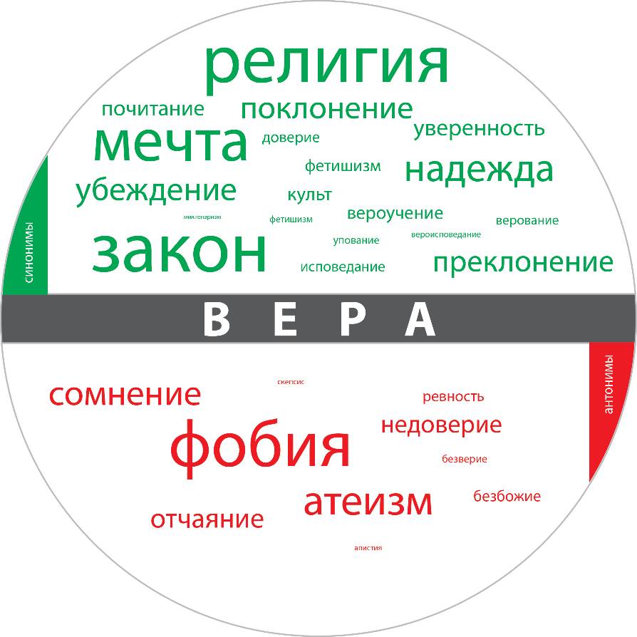 Любопытно, что синонимов у Знания существенно больше, чем антонимов. Так же и у Веры синонимический ряд представлен значительно более богато, нежели набор антонимов.