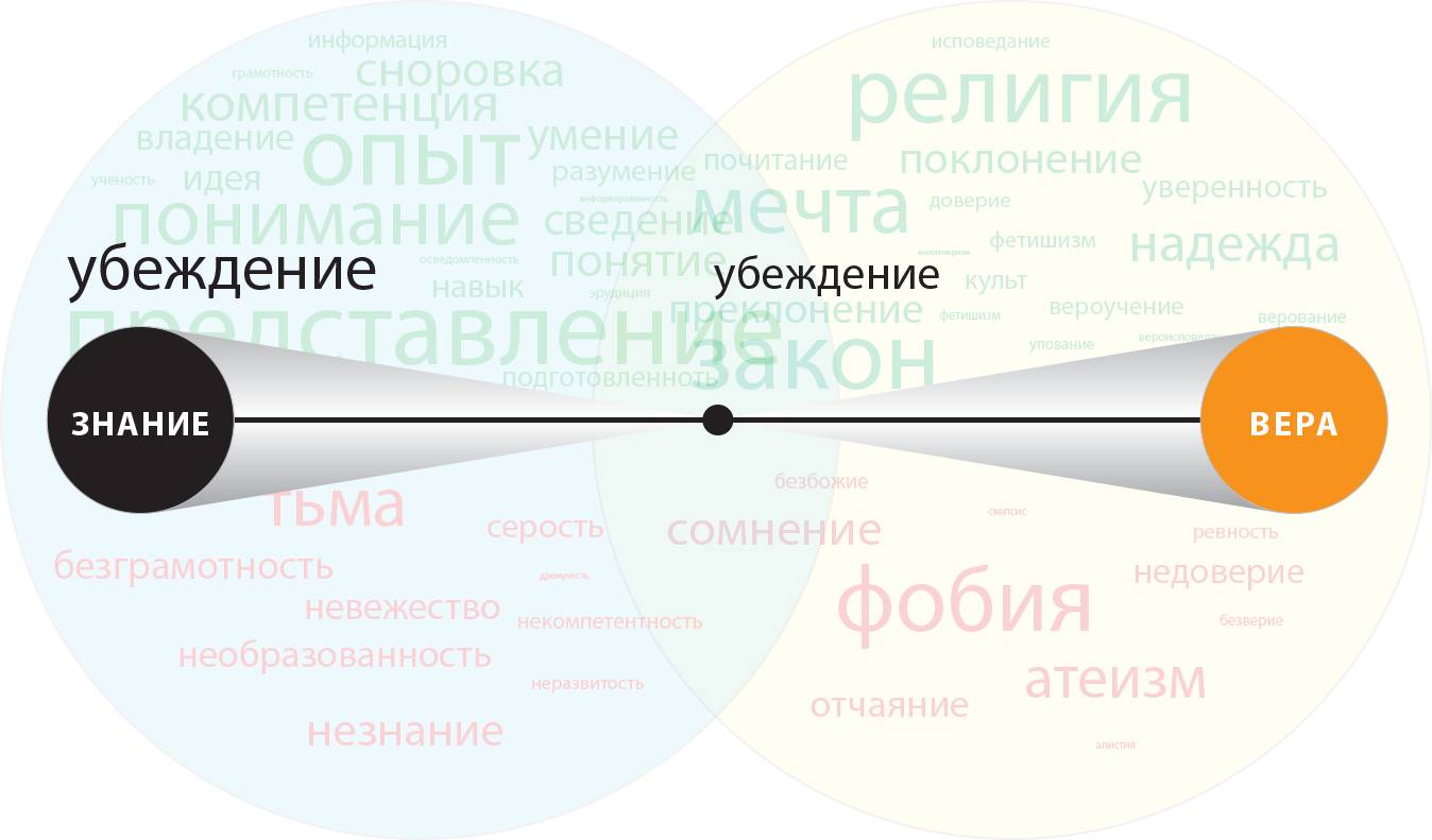 Как и Правда по отношению к Истине и Лжи, Убеждение содержит в себе и Знание, и Веру, соотношение которых в каждом человеке заставляет его позицию смещаться как в одну, так и в другую сторону.