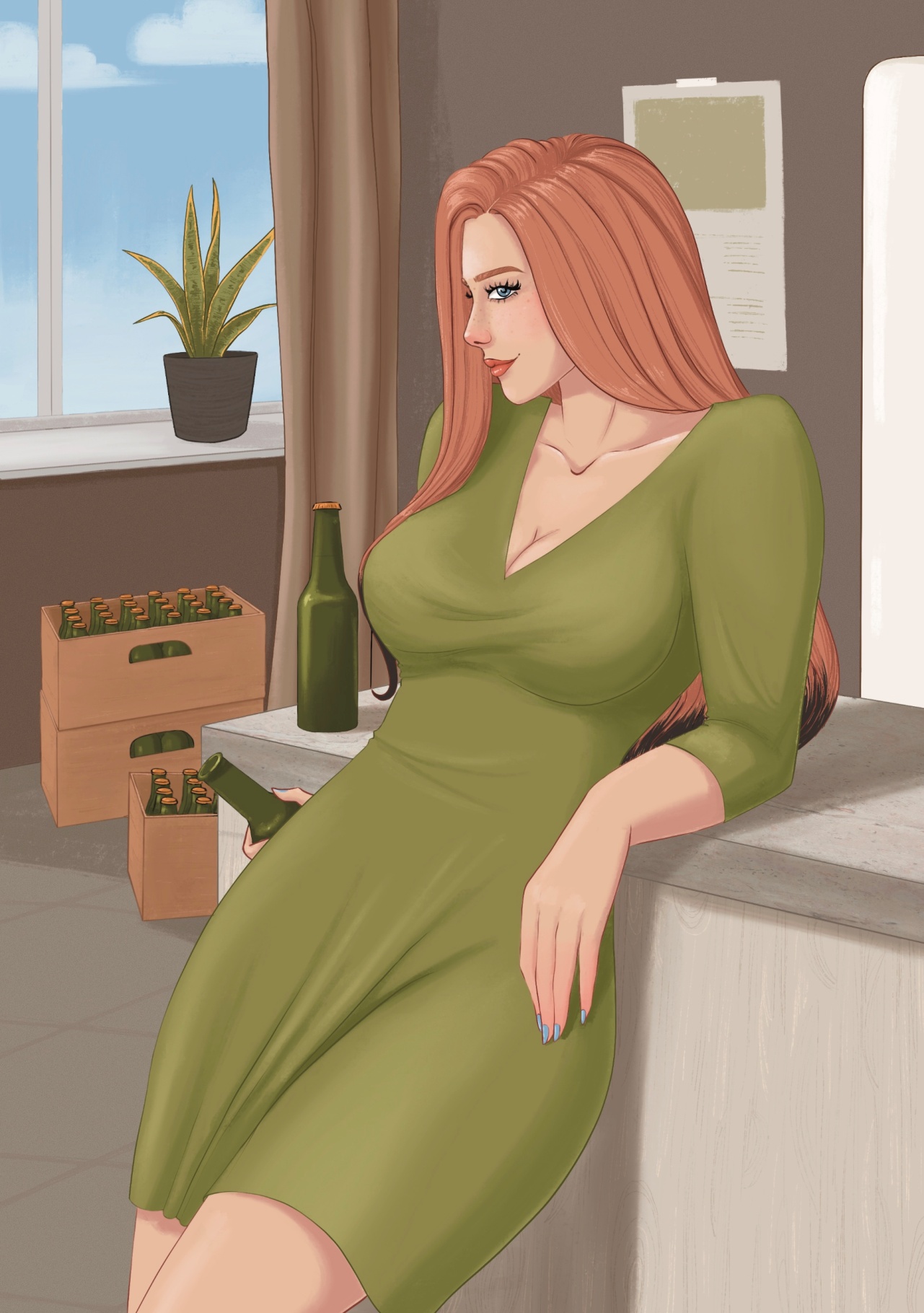 …ты хороша лишь под вино… Играла по радио Монеточка. Я сидел рядом с ящиками. Она стояла напротив, опершись об стол. Ее ногти держали бутылку, я разглядывал её платье болотного цвета, смотрел снизу на её ноги, ей шла легкая полнота. Может от пива она казалась такой нереально живописной и неотразимой… Её веснушки притягивали свет уже заходившего солнца…