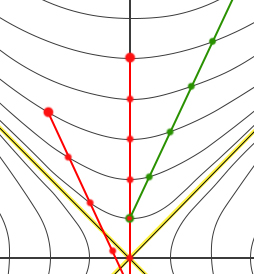 Рисунок 7 Объект (Зелёный) отсоединился от корабля (Красный) в пространсве Минковского для Мегамира