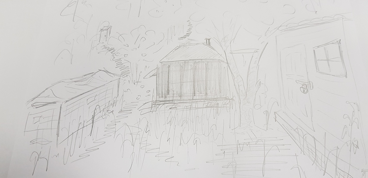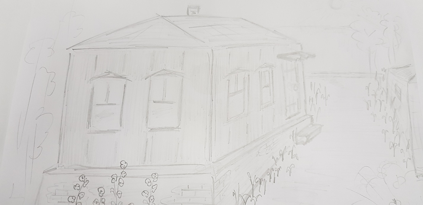 Дом. Маленький деревенский, с четырёхскатной низкой крышей. Снаружи оббит чёрным рубероидом, места крепления видно, прибиты деревянными рейками. Если подходить со стороны дороги, окон нет, чёрная стена, слева сразу крыльцо в виде навеса и деревянная дверь.