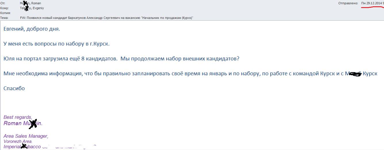 Я в течении 28,29,30 я провёл 9 телефонных собеседований с внешними кандидатами на позицию ASS Курск (все результаты разместил на портале).
