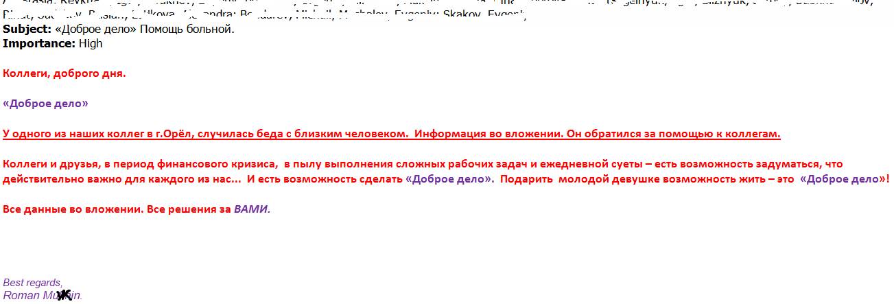 Там же на корпоративе произошло событие, на первый взгляд не очень уж выдающееся. В процессе вечеринки, ко мне подошёл один из специалистов города Орёл и попросил поговорить отдельно. Ну ок. Конечно! Давай, выкладывай. Привычное дело, что часто сотрудники ищут возможность отдельно поговорить с руководителем руководителя, что бы лишний раз рассказать о рабочих подвигах, вдруг не доходит информация до меня от его супервайзера, или о гигантской любви к компании и так далее. Просьба оказалась необычная и не совсем ожидаемая, на праздничном мероприятии. «Роман, мне очень нужна твоя помощь! Этим летом, ты организовывал мероприятие среди нашего Региона по сбору средств на помощь беженцам из Донбаса и я хочу использовать такой опыт для помощи молодой девушке, родственнице, больной онкологией. Дело в том, что у семьи нет денег, а ей нужна срочная операция иначе… времени нет…, – у него лились слёзы, – я бы сам написал, но меня никто не знает, не будет эффекта…, можешь ли ты помочь переслать информацию на коллег, я подготовил информацию?».
