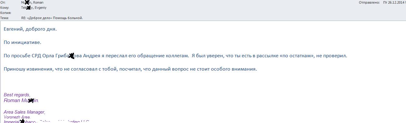 Я выслал короткое письмо и вложил обращение, которое составил мой специалист, с описанием проблемы и фото девушки. В адресаты поставил около 50 человек, скопировал адреса из региональной рассылки по остаткам товара.