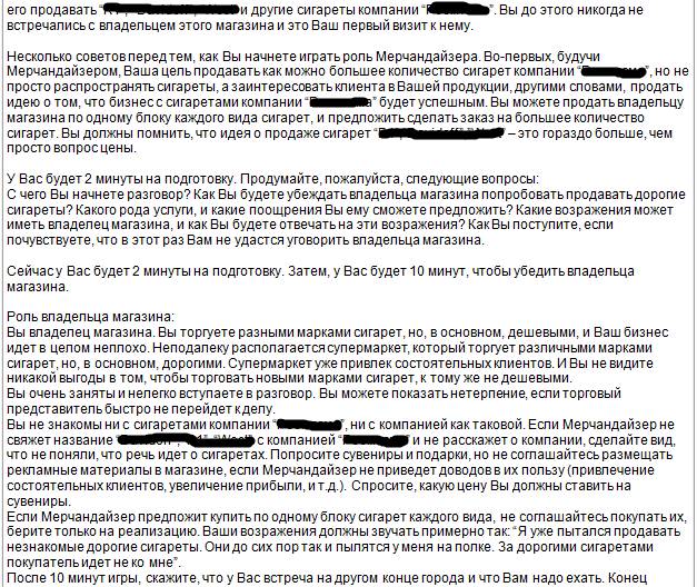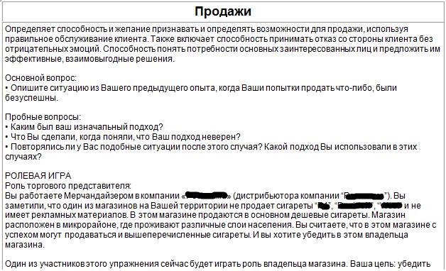 1)Одна – это проект, который позволял решить проблему с неприемлемо низким уровнем супервайзеров в области подбора персонала. При этом, нужно справедливо отметить, что на общедоступном (для штатных сотрудников конечно!) портале Компании, была достаточно подробная информация в виде «жизнеописания» процесса собеседования и очень хорошая система администрирования или сопровождения кандидатов по этапам, от беседы НR, через супервайзера к менеджеру и так далее, но, к великому сожалению отделов HR и тренинга, её не читали и не знали где она находиться на портале – даже бывалые супера. А те, немногочисленные руководители, которые читали это стандартное руководство, не применяли в работе так как написано много, написано правильно, что делать совсем не ясно. И когда я спрашивал супервайзера, почему тот или иной кандидат тебя устраивает или не устраивает, какие вопросы ты задавал, на основе чего принял решение, в ответ было «ну вот это он знает, а это не знает, работал там то, показался таким то…» Убейте меня! Вот пример одного из блоков для отдела продаж текущего документа по собеседованию: