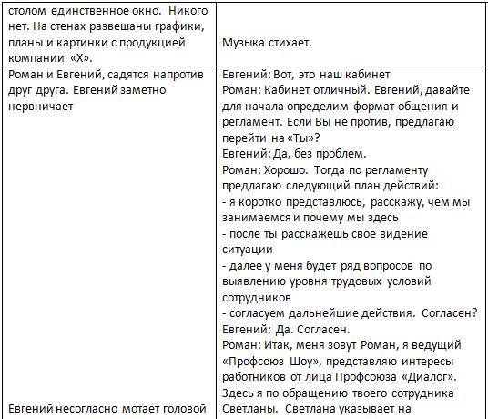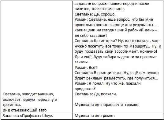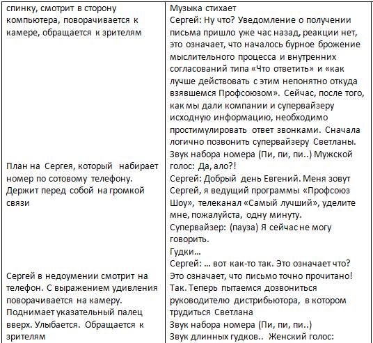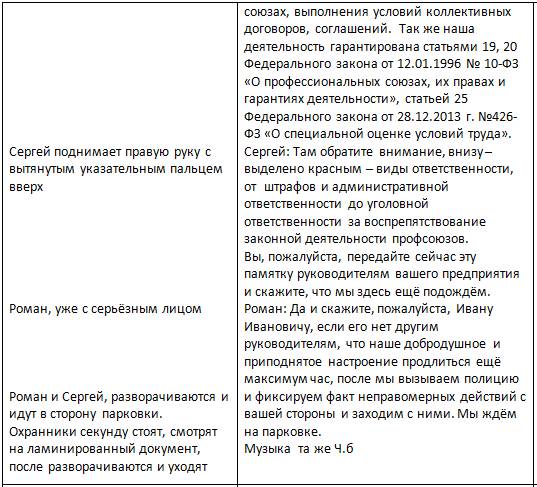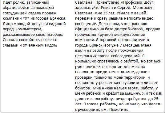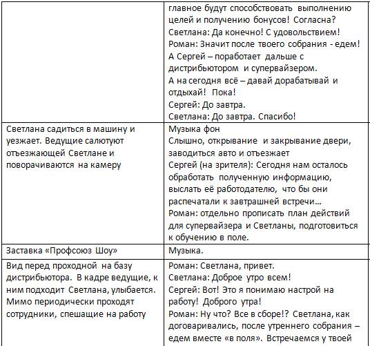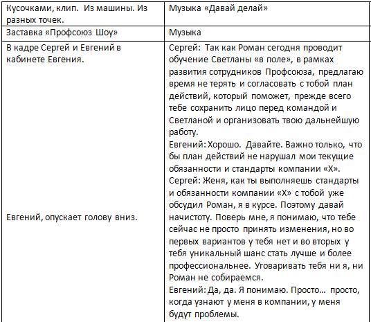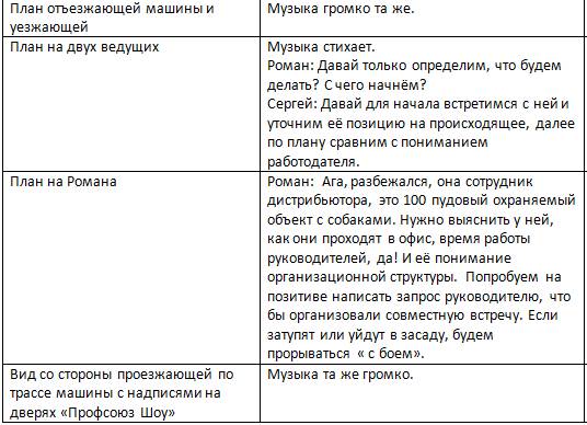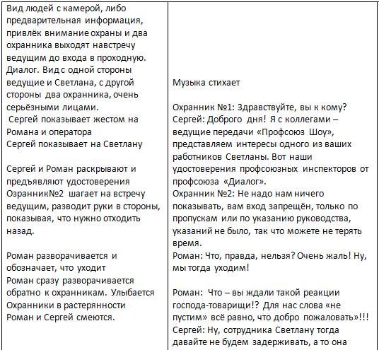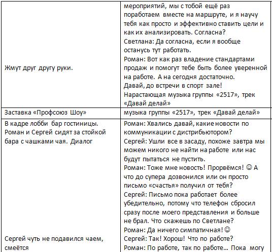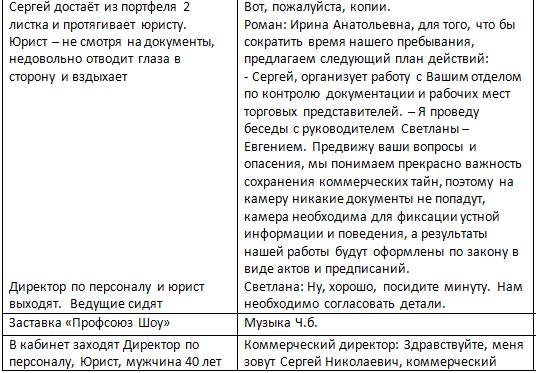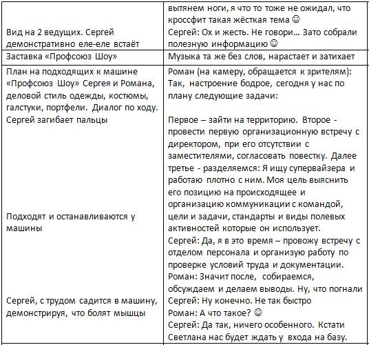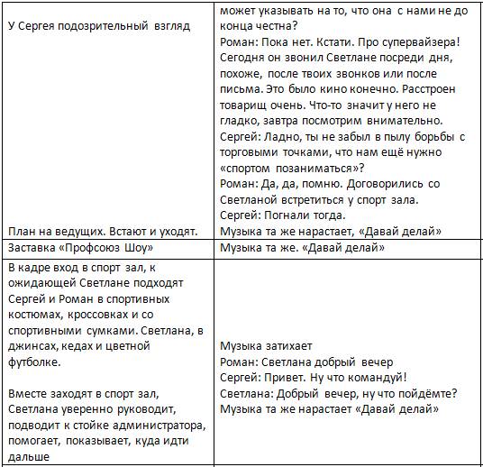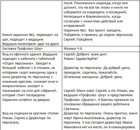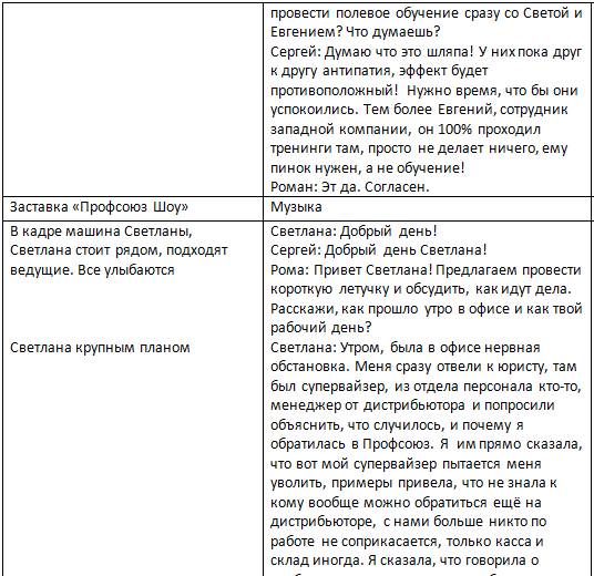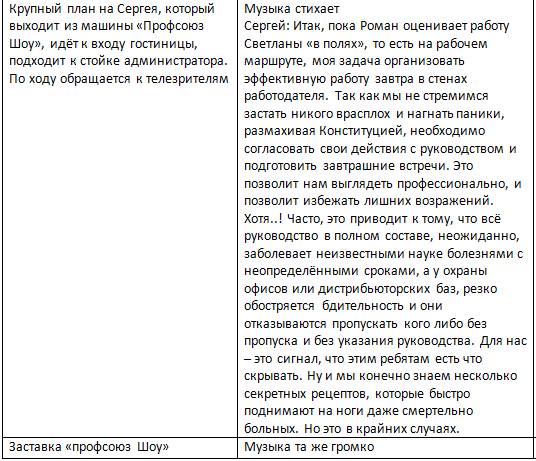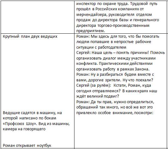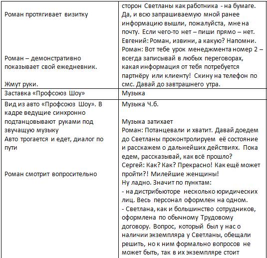 1)Заставка (начало передачи) – ролик о вечном противостоянии работодателя и работника и «спасителя» Профсоюза. В ролике 2 ведущих в деловых костюмах и боксёрских перчатках в клетке для боёв без правил. У одного на красных перчатках написано – работодатель, у второго на синих перчатках – сотрудник, в стиле клипа кадры боя, после садятся в свой угол и секундант сотрудника вместо полотенца машет книгой «Профсоюз Шоу», боец понимающе кивает и начинает движение к сопернику на 2 раунд. На этом клип останавливается. Музыка – трек группы «2517» – трек «Ч.б.» 2) Начало передачи. Приветствие ведущих. Два ведущих, руководители Профсоюза, получают сигнал о помощи от сотрудника дистрибьюторской(или иной) компании о нечеловеческих условиях работы и угрозами работодателя уволить (иными серьёзными нарушениями). Далее душераздирающий ролик от жертвы предполагаемого нарушения, с субъективной позицией «жертвы» о том, что так дальше жить нельзя и предлагающимися эмоциями. 3) Анализ проблемы и подготовка. Диалог ведущих с анализом исходной информации, при котором один ведущий занимает позицию жертвы», второй – сомневается и ищет нестыковки. По дороге на место – обсуждение деталей и возможного развития событий (часть дороги ускоренно – обозначить). Фоновая музыка трек группы «2517» – трек «Ч.б.». 4) Основная часть – 4.1Встреча с героем – знакомство – уточнение деталей по ситуации и участникам. Как правило «герой» обвиняет всех вокруг в некомпетентности и незаконных действиях в его отношении. 4.2 Для более объективного анализа необходимо увидеть «героя» в жизни, ещё лучше в неформальном общении с коллегами, корпоративные активности, спорт. Совместное участие ведущих в корпоративном спорте, активности, вопросы коллегам, наблюдение за поведением «героя передачи» в коллективе и отношения к нему со стороны коллег. Короткое резюме ведущих в диалоге. 4.3 Встреча с работодателем, начинается с «квеста» как попасть на рабочее место «героя программы», разборки с охраной, звонки руководителям. Встреча с руководителем, приветствие, описание ситуации – фиксация поведения. Версия руководителя по конфликту. Обратное обвинение работника в неисполнении служебных обязанностей, получение дополнительной информации о нарушениях и замечаниях. Согласование с руководителем необходимости провести Профсоюзное расследование – 2 направления анализа Ведущий №1 – анализ рабочего места, рабочего дня, совместный визиты в течении рабочего дня, аудит выполнения стандартов и знаний «героя программы», №2 – документация и правовые нормы, журналы проведения инструктажей, общение со службой персонала 4.4 Диалог ведущих о результатах исследования по направлениям – постановка «Диагноза» – кто виноват на основе полученной информации(чаще виноваты обе стороны, а иногда «герой» становиться – антигероем, который пытался оговорить работодателя), согласование мероприятий по исправлению. 4.5 Реализация действий по отношению к герою (обучение на рабочем месте, ведущий и «герой передачи» вдвоём – для настроя на доверительную работу обсуждение города пребывания, достопримечательностей. В процессе работы -демонстрация Тренинг цикла и обучение выявленному пробелу в умениях и навыках, в процессе общения – эмоциональная мотивация на достижение результата, конкретизация жизненных ц