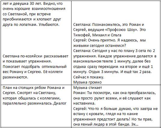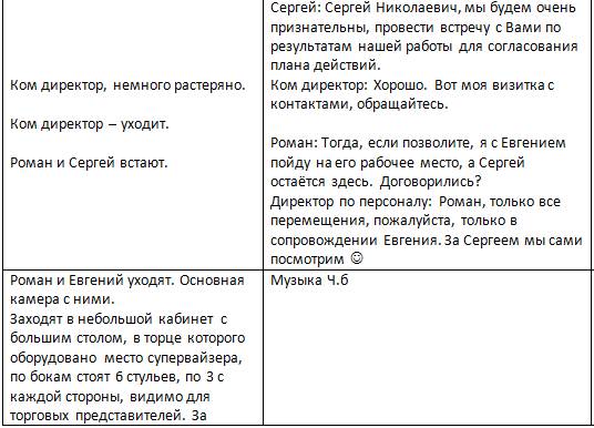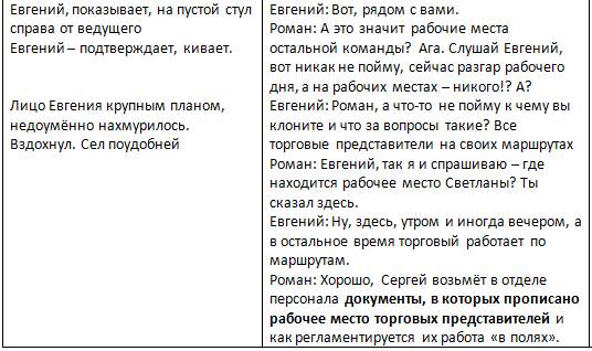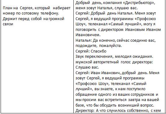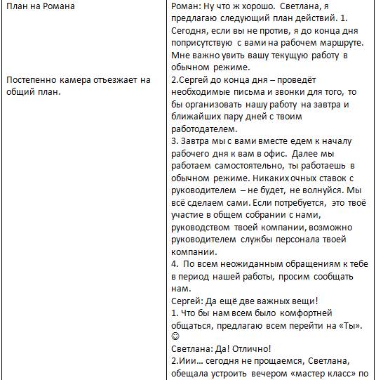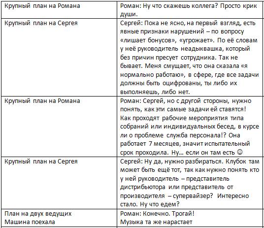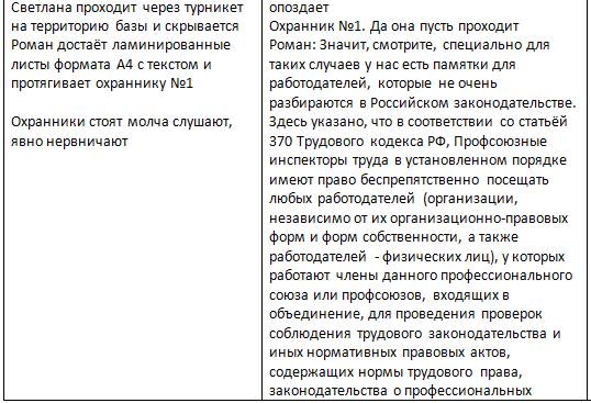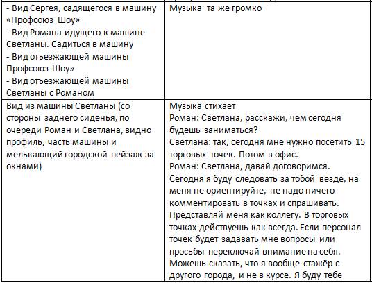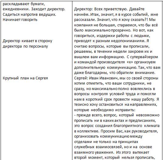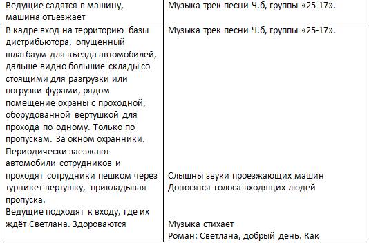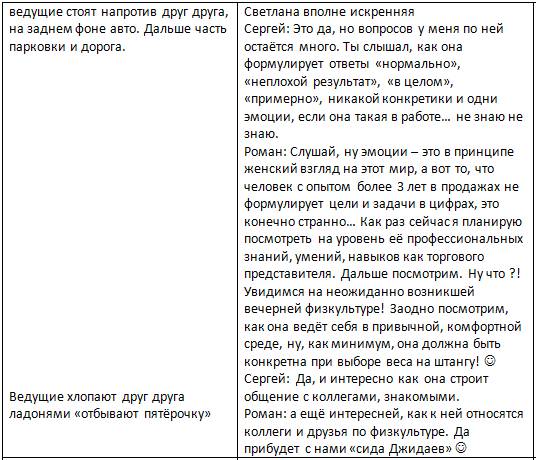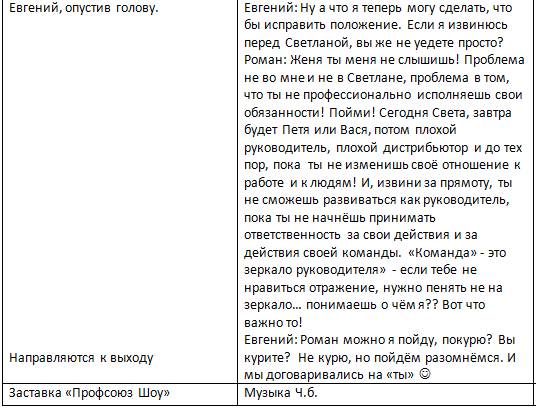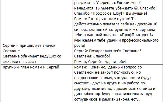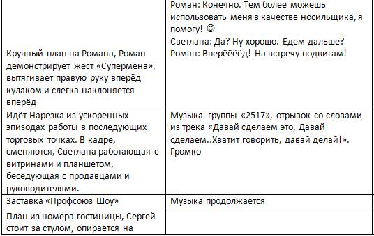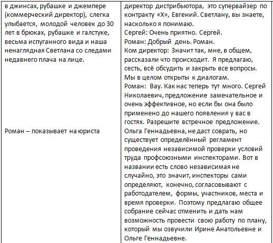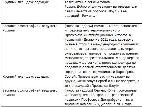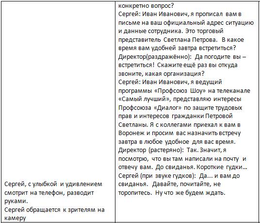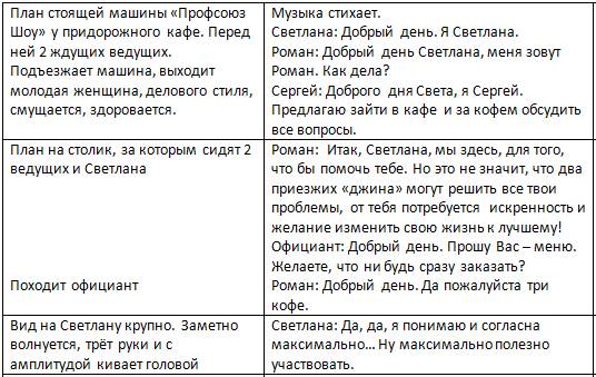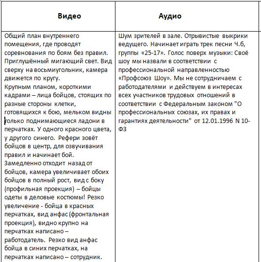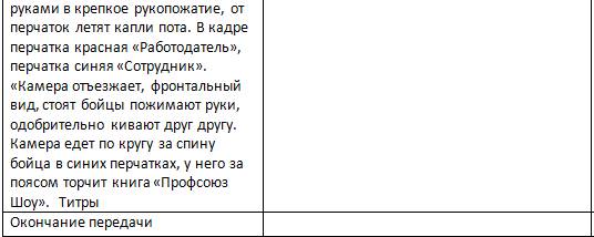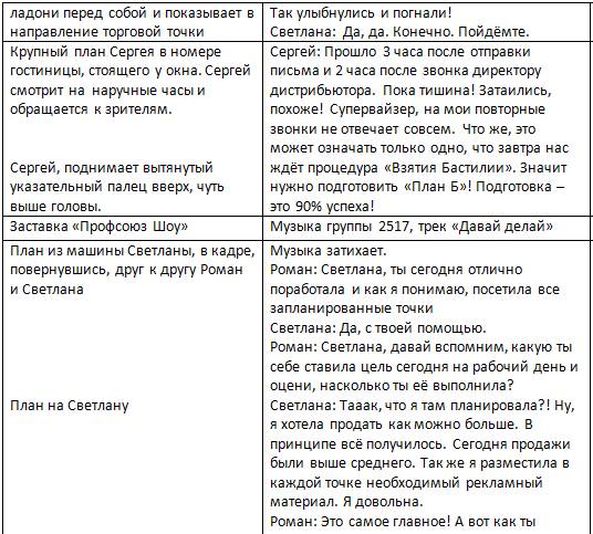 1)Заставка (начало передачи) – ролик о вечном противостоянии работодателя и работника и «спасителя» Профсоюза. В ролике 2 ведущих в деловых костюмах и боксёрских перчатках в клетке для боёв без правил. У одного на красных перчатках написано – работодатель, у второго на синих перчатках – сотрудник, в стиле клипа кадры боя, после садятся в свой угол и секундант сотрудника вместо полотенца машет книгой «Профсоюз Шоу», боец понимающе кивает и начинает движение к сопернику на 2 раунд. На этом клип останавливается. Музыка – трек группы «2517» – трек «Ч.б.» 2) Начало передачи. Приветствие ведущих. Два ведущих, руководители Профсоюза, получают сигнал о помощи от сотрудника дистрибьюторской(или иной) компании о нечеловеческих условиях работы и угрозами работодателя уволить (иными серьёзными нарушениями). Далее душераздирающий ролик от жертвы предполагаемого нарушения, с субъективной позицией «жертвы» о том, что так дальше жить нельзя и предлагающимися эмоциями. 3) Анализ проблемы и подготовка. Диалог ведущих с анализом исходной информации, при котором один ведущий занимает позицию жертвы», второй – сомневается и ищет нестыковки. По дороге на место – обсуждение деталей и возможного развития событий (часть дороги ускоренно – обозначить). Фоновая музыка трек группы «2517» – трек «Ч.б.». 4) Основная часть – 4.1Встреча с героем – знакомство – уточнение деталей по ситуации и участникам. Как правило «герой» обвиняет всех вокруг в некомпетентности и незаконных действиях в его отношении. 4.2 Для более объективного анализа необходимо увидеть «героя» в жизни, ещё лучше в неформальном общении с коллегами, корпоративные активности, спорт. Совместное участие ведущих в корпоративном спорте, активности, вопросы коллегам, наблюдение за поведением «героя передачи» в коллективе и отношения к нему со стороны коллег. Короткое резюме ведущих в диалоге. 4.3 Встреча с работодателем, начинается с «квеста» как попасть на рабочее место «героя программы», разборки с охраной, звонки руководителям. Встреча с руководителем, приветствие, описание ситуации – фиксация поведения. Версия руководителя по конфликту. Обратное обвинение работника в неисполнении служебных обязанностей, получение дополнительной информации о нарушениях и замечаниях. Согласование с руководителем необходимости провести Профсоюзное расследование – 2 направления анализа Ведущий №1 – анализ рабочего места, рабочего дня, совместный визиты в течении рабочего дня, аудит выполнения стандартов и знаний «героя программы», №2 – документация и правовые нормы, журналы проведения инструктажей, общение со службой персонала 4.4 Диалог ведущих о результатах исследования по направлениям – постановка «Диагноза» – кто виноват на основе полученной информации(чаще виноваты обе стороны, а иногда «герой» становиться – антигероем, который пытался оговорить работодателя), согласование мероприятий по исправлению. 4.5 Реализация действий по отношению к герою (обучение на рабочем месте, ведущий и «герой передачи» вдвоём – для настроя на доверительную работу обсуждение города пребывания, достопримечательностей. В процессе работы -демонстрация Тренинг цикла и обучение выявленному пробелу в умениях и навыках, в процессе общения – эмоциональная мотивация на достижение результата, конкретизация жизненных ц