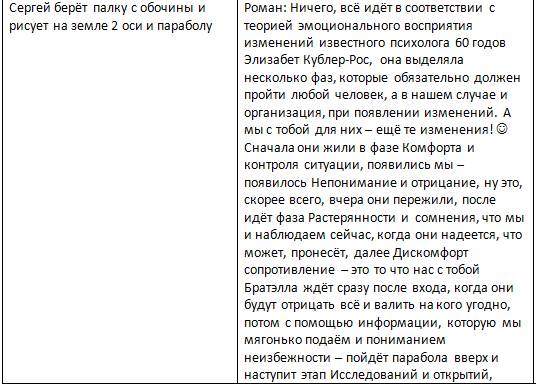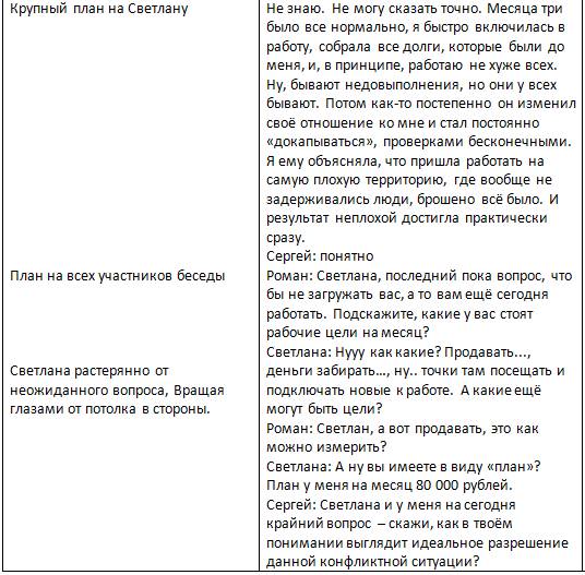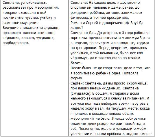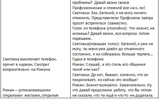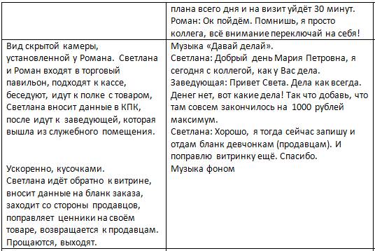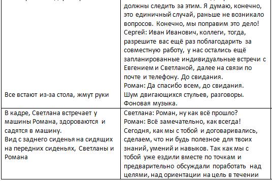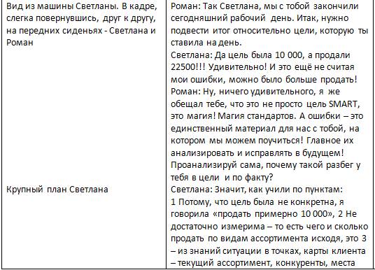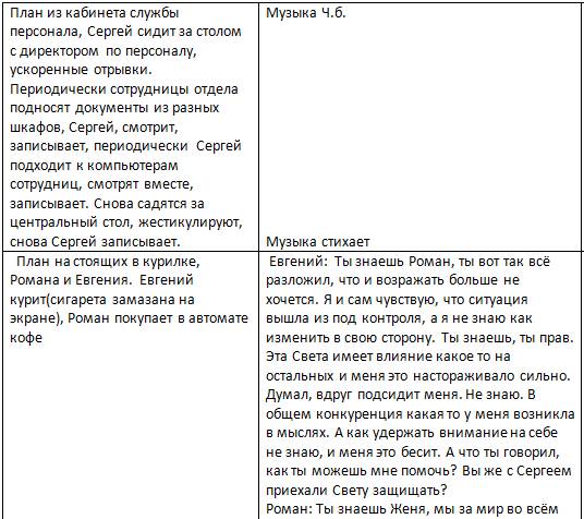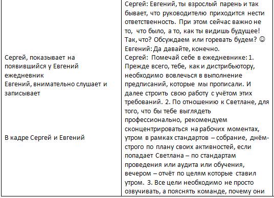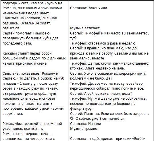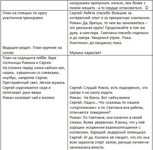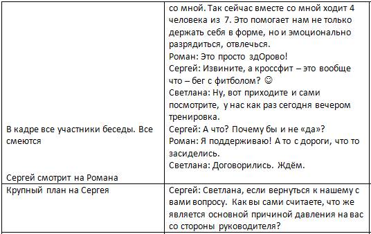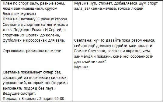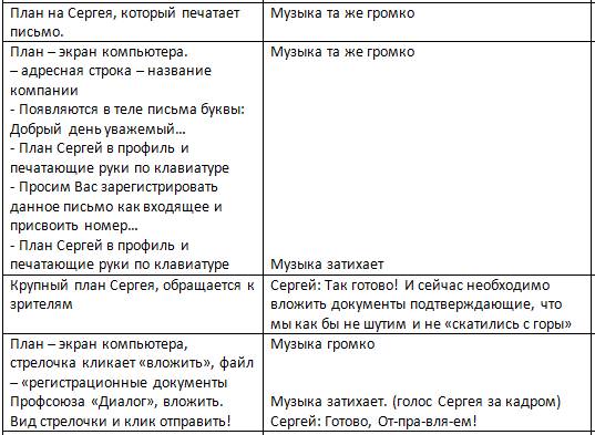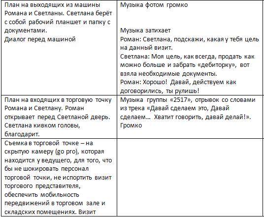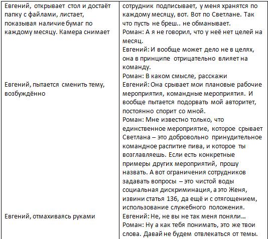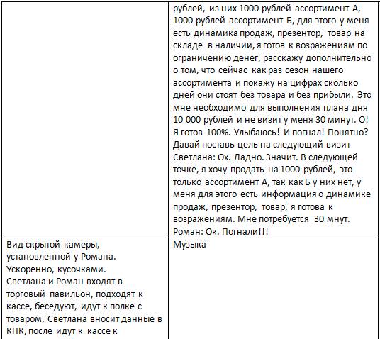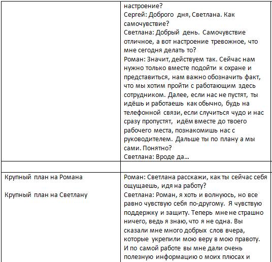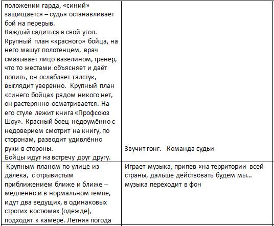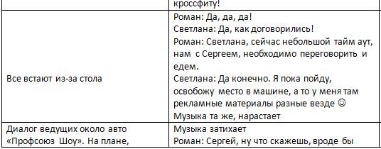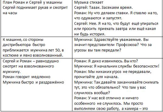 1)Заставка (начало передачи) – ролик о вечном противостоянии работодателя и работника и «спасителя» Профсоюза. В ролике 2 ведущих в деловых костюмах и боксёрских перчатках в клетке для боёв без правил. У одного на красных перчатках написано – работодатель, у второго на синих перчатках – сотрудник, в стиле клипа кадры боя, после садятся в свой угол и секундант сотрудника вместо полотенца машет книгой «Профсоюз Шоу», боец понимающе кивает и начинает движение к сопернику на 2 раунд. На этом клип останавливается. Музыка – трек группы «2517» – трек «Ч.б.» 2) Начало передачи. Приветствие ведущих. Два ведущих, руководители Профсоюза, получают сигнал о помощи от сотрудника дистрибьюторской(или иной) компании о нечеловеческих условиях работы и угрозами работодателя уволить (иными серьёзными нарушениями). Далее душераздирающий ролик от жертвы предполагаемого нарушения, с субъективной позицией «жертвы» о том, что так дальше жить нельзя и предлагающимися эмоциями. 3) Анализ проблемы и подготовка. Диалог ведущих с анализом исходной информации, при котором один ведущий занимает позицию жертвы», второй – сомневается и ищет нестыковки. По дороге на место – обсуждение деталей и возможного развития событий (часть дороги ускоренно – обозначить). Фоновая музыка трек группы «2517» – трек «Ч.б.». 4) Основная часть – 4.1Встреча с героем – знакомство – уточнение деталей по ситуации и участникам. Как правило «герой» обвиняет всех вокруг в некомпетентности и незаконных действиях в его отношении. 4.2 Для более объективного анализа необходимо увидеть «героя» в жизни, ещё лучше в неформальном общении с коллегами, корпоративные активности, спорт. Совместное участие ведущих в корпоративном спорте, активности, вопросы коллегам, наблюдение за поведением «героя передачи» в коллективе и отношения к нему со стороны коллег. Короткое резюме ведущих в диалоге. 4.3 Встреча с работодателем, начинается с «квеста» как попасть на рабочее место «героя программы», разборки с охраной, звонки руководителям. Встреча с руководителем, приветствие, описание ситуации – фиксация поведения. Версия руководителя по конфликту. Обратное обвинение работника в неисполнении служебных обязанностей, получение дополнительной информации о нарушениях и замечаниях. Согласование с руководителем необходимости провести Профсоюзное расследование – 2 направления анализа Ведущий №1 – анализ рабочего места, рабочего дня, совместный визиты в течении рабочего дня, аудит выполнения стандартов и знаний «героя программы», №2 – документация и правовые нормы, журналы проведения инструктажей, общение со службой персонала 4.4 Диалог ведущих о результатах исследования по направлениям – постановка «Диагноза» – кто виноват на основе полученной информации(чаще виноваты обе стороны, а иногда «герой» становиться – антигероем, который пытался оговорить работодателя), согласование мероприятий по исправлению. 4.5 Реализация действий по отношению к герою (обучение на рабочем месте, ведущий и «герой передачи» вдвоём – для настроя на доверительную работу обсуждение города пребывания, достопримечательностей. В процессе работы -демонстрация Тренинг цикла и обучение выявленному пробелу в умениях и навыках, в процессе общения – эмоциональная мотивация на достижение результата, конкретизация жизненных ц