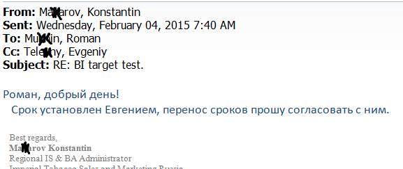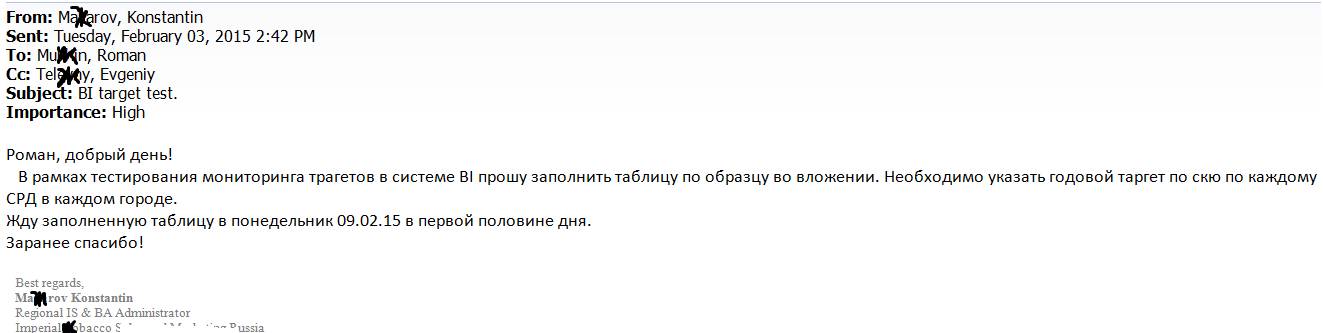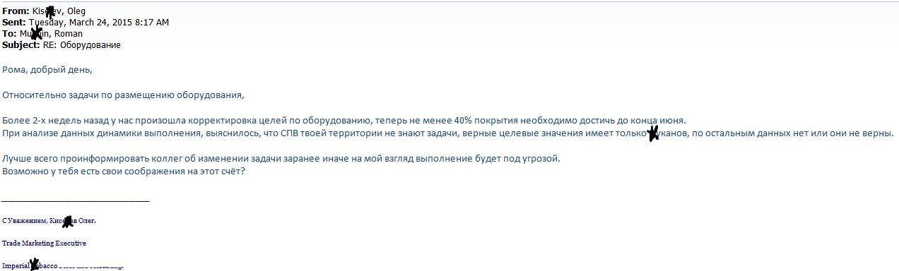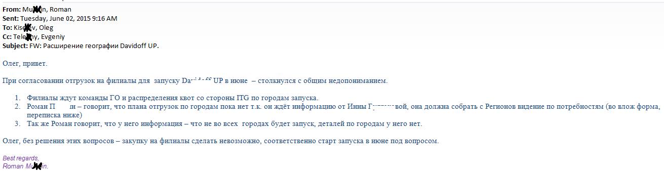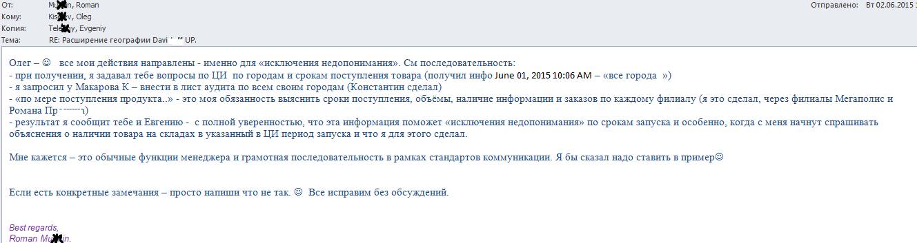 Второй пример с Олегом (региональный трейд маркетинг специалист), показывает, как настойчиво Коллеги, (Босс в копии), пытались не допустить, ограничить моё общение с руководителями логистики и маркетинга. При этом сами не имели необходимой детальной информации по процессам на территориях, о которых писали. Не всегда конечно. Но как вы думаете, зачем я начал решать вопросы напрямую с национальным менеджерами по логистики Романом П? Наверно потому, что путь моих вопросов к ним через моего руководителя, оказывался тернистым, растянутым во времени, наполнен моими напоминалками о том, что вопрос не решается, и в итоге – мало эффективным. А вот – спрашивали за выполнение, как не удивительно, регулярно. И отвечать нужно было быстро! Так вот, очередная задача, организовать своевременную закупку по каждому филиалу дистрибутора упёрлась в решение вопросов в нашей же компании.
