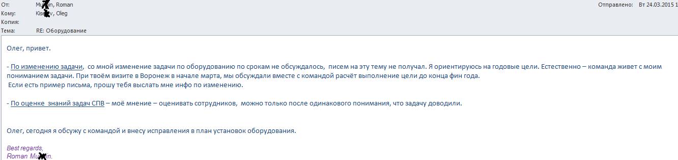 – По изменению задачи, со мной изменение задачи по оборудованию по срокам не обсуждалось, писем на эту тему не получал. Я ориентируюсь на годовые цели. Естественно – команда живет с моим пониманием задачи. При твоём визите в Воронеж в начале марта, мы обсуждали вместе с командой расчёт выполнение цели до конца финансового года.