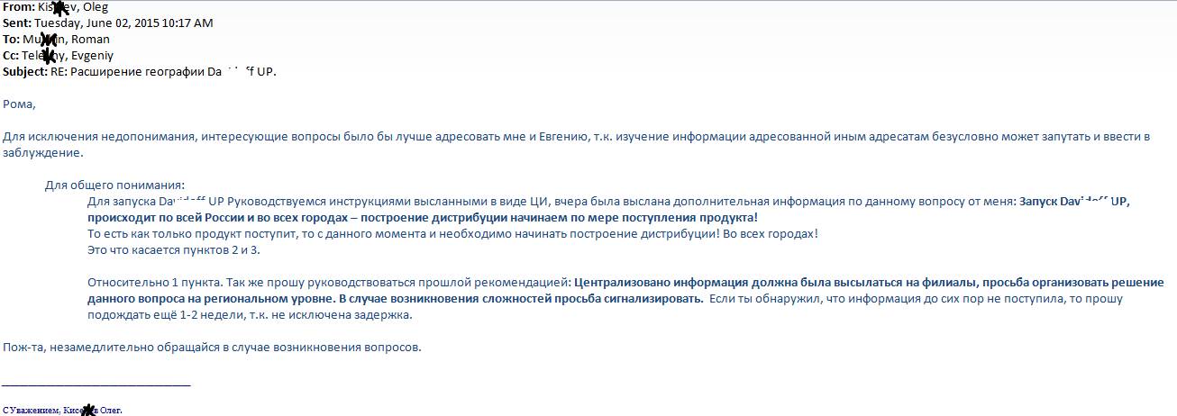 Для запуска Dav… UP Руководствуемся инструкциями высланными в виде ЦИ, вчера была выслана дополнительная информация по данному вопросу от меня: Запуск Dav.. UP, происходит по всей России и во всех городах – построение дистрибуции начинаем по мере поступления продукта!