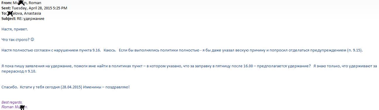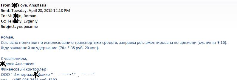 Даже досталось региональному аналитику, она же финансовый контролёр, которая, вдруг, разглядела однажды заправку корпоративного автомобиля в пятницу после 16.00 и поспешила запросить у меня, естественно письменное объяснение за нарушение Политик компании и моё согласие на удержание из ЗП стоимости 40 литров . И здесь, пришлось расстроить. Не углядела она, что я в пятницу, по плану полевых активностей и по плану командировок, возвращался с рабочей командировки и, что по Политикам удержание возможно только за перерасход ГСМ при авансовом отчёте, коих у меня никогда не было.