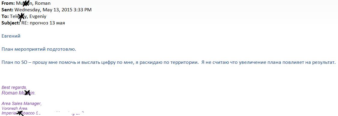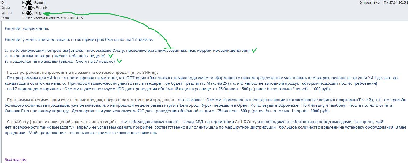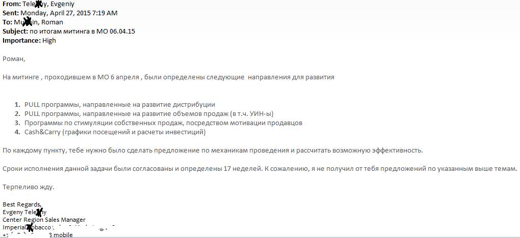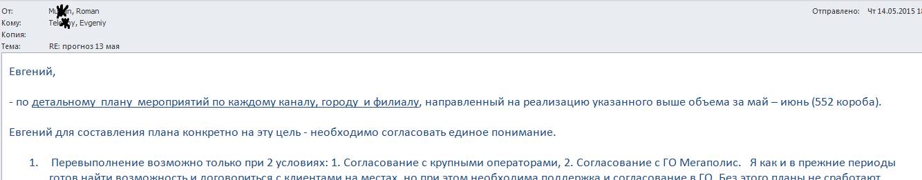 Каждый очередной «заход» становился всё более эмоциональным и неприкрытым с точки зрения ожидаемых целей. К лету 2015 я уже практически не мог выполнять свои планы по полевым активностям, в части обучения в поле, т.к. по стандартам нужен был целый день, а меня дёргали постоянно, естественно с требованием «срочно предоставить», «срочно выслать», «срочно прокомментировать». А что бы дать аргументированный ответ, нужно либо проанализировать кучу отчётов, данных, либо обзвонить все города по супервайзерам или директорам филиалов дистрибутора, после сбить в требуемый формат, проверить и отправлять. Помощников у меня не было. Вопрос делегирования я, конечно, использовал, но только касательно плановых задач через своего менеджера по ОПТу и, иногда, ответственного супервайзера в Воронеже Миши БонЖарева. В режиме «пожарной команды» надеется было не на кого, инфо сразу по всем городам территории была только у меня, поэтому при ответе на «горящие» запросы я добавлял «для выполнения данной задачи, вынужден скорректировать свою активность», например, досрочно завершить аудит или перенести переговоры с клиентом. Вот, один из миллиарда примеров: