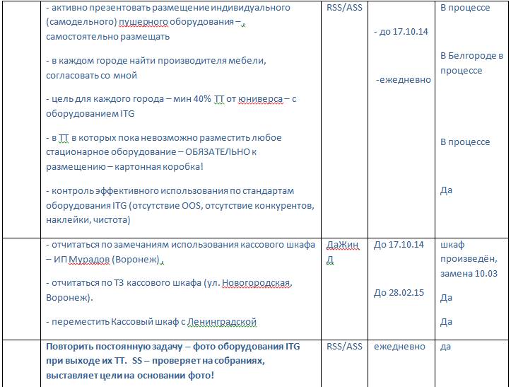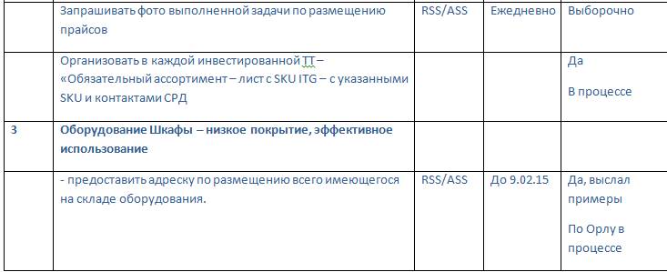 – Cash&Carry (графики посещений и расчеты инвестиций) – мы обсуждали возможность выезда СРД на территории Cash&Carry и необходимость обоснования перед выездами. На апрель, май нет возможности таких выездов т.к. апрель не успеваем сделать покрытие, соответственно выполнить цель по маршрутной дистрибуции +большое количество времени на установку оборудования. В мае праздники. Моё предложение – использовать время согласованных визитов.