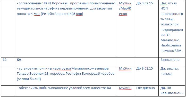 – можно улучшить качество работы с Директорами и НОП – я высылал тебе предложения в декабре 2014 (влож) по; 1 Проведению совместных встреч за столом. 2 По организации подарков на ДР (делал расчёт). Да данный момент, реализую за свой счёт, по возможностям. 3 Проведение совместного мероприятия/акции команд ITG и Мегаполис. Делал тебе несколько обоснований, пока не подтверждено.