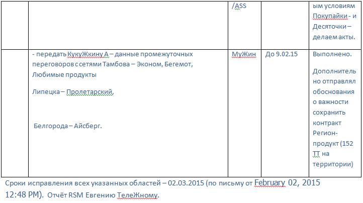 – За последний квартал мы вынужденно сократили матрицы в ведущих сетях, что бы остаться работать с ними и не превысить стоимость прошлого года(в рамках целей по бюджету на 2015 от Трейд маркетинга). Романченко, БЭР, Винегрет, Регионпродукт . Отказ сети Липецка Покупайка. Сейчас под вопросом работа с сетями Центрторг (47 СМ) и Висант-торг (40 СМ) из-за предложения ВАТ. Будет сокращение матрицы в сети Европа (итак 7 SKU) и под вопросом работа с сетью Паллада Торг 138 тт (инфо от КАМ КукуЖкина А).