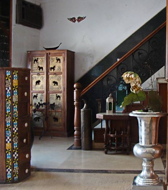 Это была наша первая гостиница в Индии – HOTEL RELAX. Крошечное фойе с белым мраморным полом было украшено деревянными шкафчиками с инкрустацией и массивными напольными вазами из блестящего металла. Обилие мелких предметов интерьера – бронзовых статуэток, старинных светильников, пепельниц – создавало здесь удивительно уютную атмосферу.
