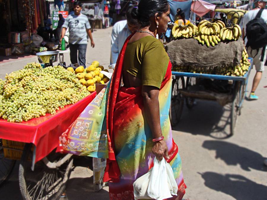 Мусор появлялся благодаря продавцам съестного, что раскладывали свой товар прямо на асфальте, покрытом выцветшими покрывалами. Рядом с одним торговцем словно из ниоткуда выросли огромные гроздья бананов, другого окружили бидоны с броской надписью BEST MILK, третий сел в позе лотоса у телеги, наполненной роскошным виноградом. Широкобедрая индианка в сари с пронзительными красными всполохами сняла с головы большую плетеную корзину, в которой пирамидой были выложены ярко-оранжевые мандарины, и опустила ее на коробку из-под телевизора.