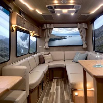 1. Уютная гостиная в доме на колесах, в мягких оттенках коричневого, синего, бежевого и серого; деревянный пол; светодиодная установка, плавно меняющая цвета; элегантная и многофункциональная современная мебель в минималистских линиях; потрясающий вид из окон; на стенах интерактивные цифровые произведения искусства; ощущение роскоши и комфорта в этом мобильном пространстве.