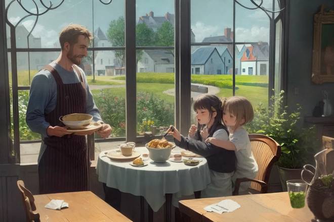 2. Утро в небольшом провинциальном городке, ресторан уютной гостиницы на несколько постояльцев. За большим окном открывается вид на улицу с невысокими живописными домами в пастельной гамме. Две девочки-сестренки, не дожидаясь родителей, пришли на завтрак и сидят за столом. Младшая сестра забралась в кресло к старшей, стоит у нее за спиной, обхватив руками за плечи, и мешает ей брать тосты. Слева стоит официант, в руках у него деревянный поднос с блюдом, он готов поставить его на стол. Официант с добродушной улыбкой смотрит на девочек. Картинка в духе реалистического аниме, с элементами стиля Акеми Такада; цифровая живопись; рассеянное боковое освещение с акцентом на детских лицах; неброская цветовая гамма с приглушенными тонами, в центре колористической композиции – накрытый белой скатертью стол. Общее ощущение неторопливости и расслабленности. Изображение создает немного ленивое, но приятное настроение.