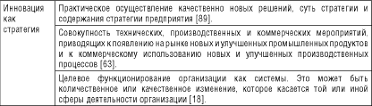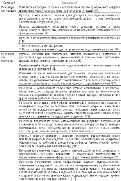 Каноническое определение инноваций в теории Й. Шумпетера, ориентированное на форму реализации новшеств, вызвало в современных условиях множество трактовок данной категории. Представляется возможным сгруппировать ряд из них по трем критериям: 1) инновация как процесс, 2) как результат и 3) как стратегия (табл. 1.1).