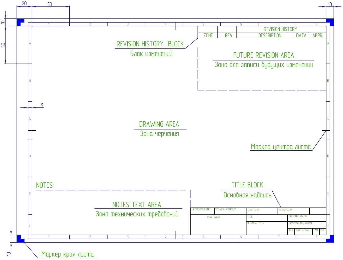 Лист условно разделяется на функциональные зоны и блоки. Лист имеет три функциональных зоны – зона черчения DRAWING AREA, зона записи технических требований NOTES TEXT AREA, зона для записи изменений FUTURE REVISION AREA.