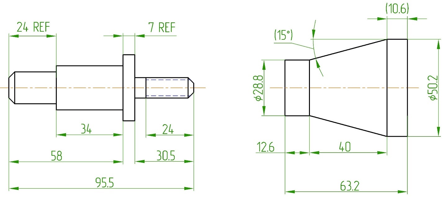 Справочные размеры (рисунок 12) указывают двумя возможными способами. Первый способ заключается в написании REF (сокращение от REFERENCE) справа или под размерным числом. Второй способ заключается во взятии в скобки () размерного числа справочного размера. Необходимо придерживаться только одного выбранного правила указания справочных размеров.