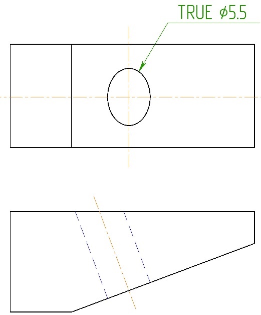 Рекомендуется расставлять размеры конструктивных элементов только на тех видах и разрезах, на которых эти поверхности являются видимыми и неискаженными. Однако при оформлении сложных и насыщенных чертежей выполнить рекомендуемое не всегда удается. Если на виде изображена поверхность в искаженном виде, и размер необходимо поставить также на этом же виде, то около размерного числа пишется слово TRUE. Это говорит о том, что размерное число указано истинное, не смотря на искажение изображенной поверхности (рисунок 13).