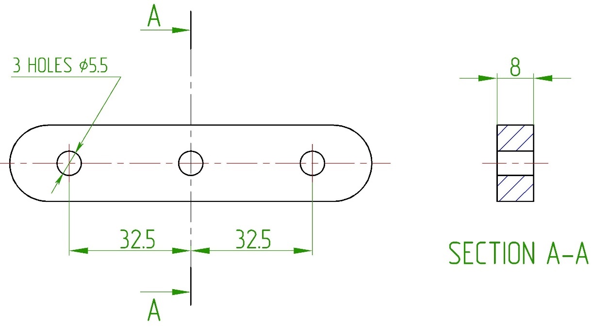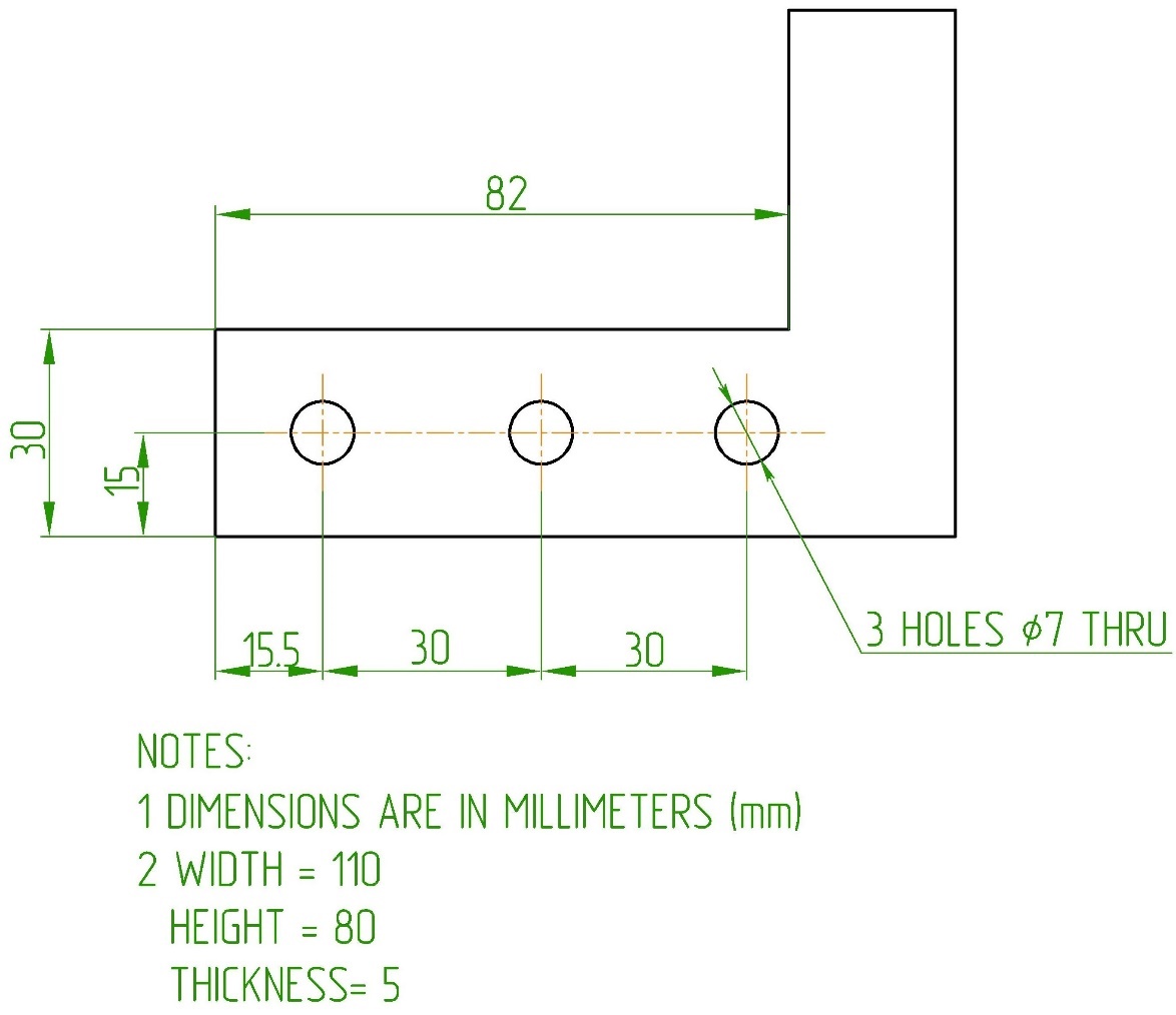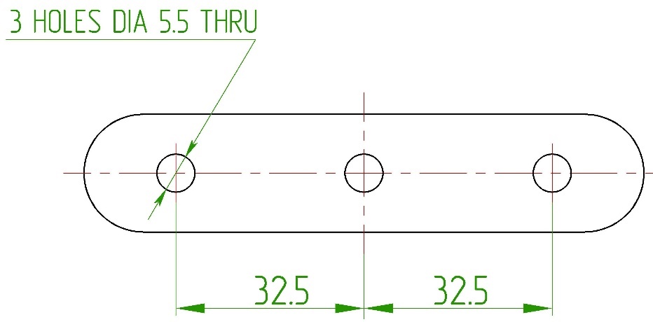 Если имеется несколько одинаковых отверстий, их количество и диаметр на размерной линии обозначают текстом (рисунок 16), например так: 3 HOLES 5.5, что обозначает 3 отверстия, диаметр 5,5.