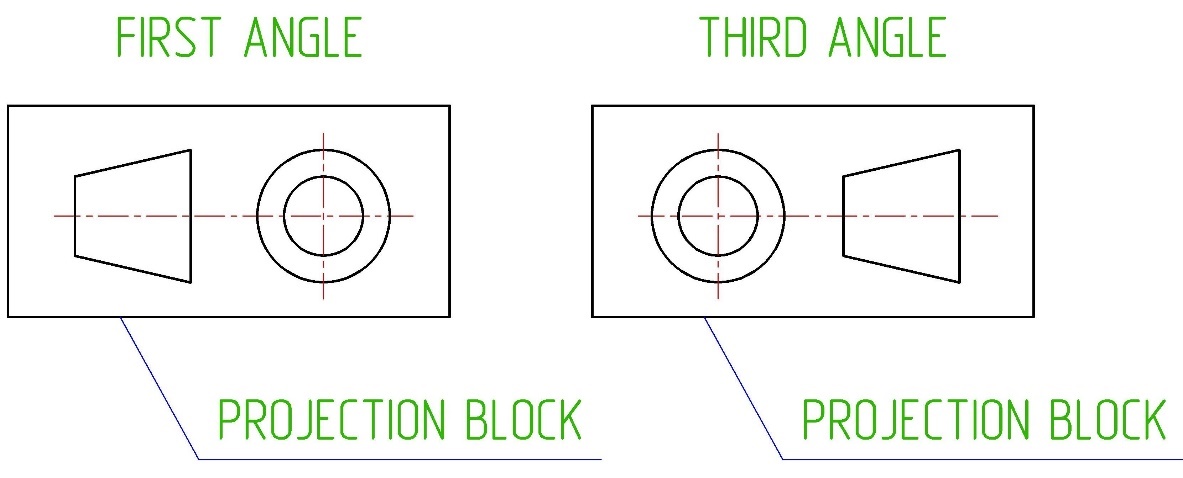 Приступая к чтению импортного чертежа, первым делом необходимо посмотреть в основную надпись и узнать, какой метод построения проекций используется в нем, чтобы избежать крупных ошибок. Несмотря на то, что PROJECTION BLOCK является необязательным полем данных основной надписи, его все равно рекомендуется включать в основную надпись.