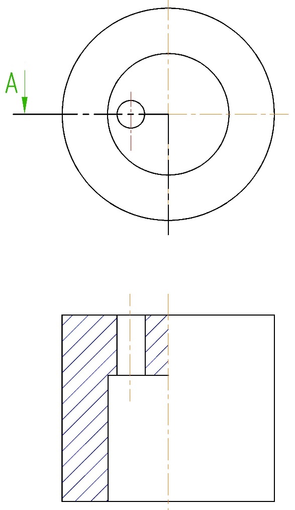 Линии сечений, (короткие утолщенные линии, на которых мы ставим стрелки направления взгляда), в чертежах ISO соединяются штрихпунктирной линией (рисунок 8). Штрихпунктирная линия вычерчивается утолщенной. Это довольно удобно, так как наглядно видно прохождение траектории разреза без необходимости прикладывания линейки к чертежу. На отечественных чертежах такое соединение штрихпунктирной линией допускается, но на практике применяется довольно редко.