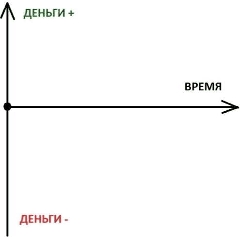 В отличии от времени, ДЕНЬГИ это возобновимый ресурс, поэтому мы можем деньги не только тратить (схематично показано как «Деньги-»), но также и приобретать («Деньги+»).