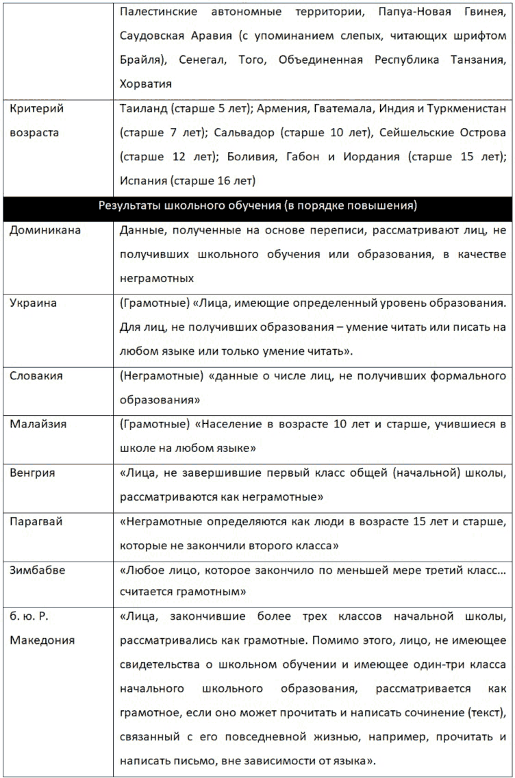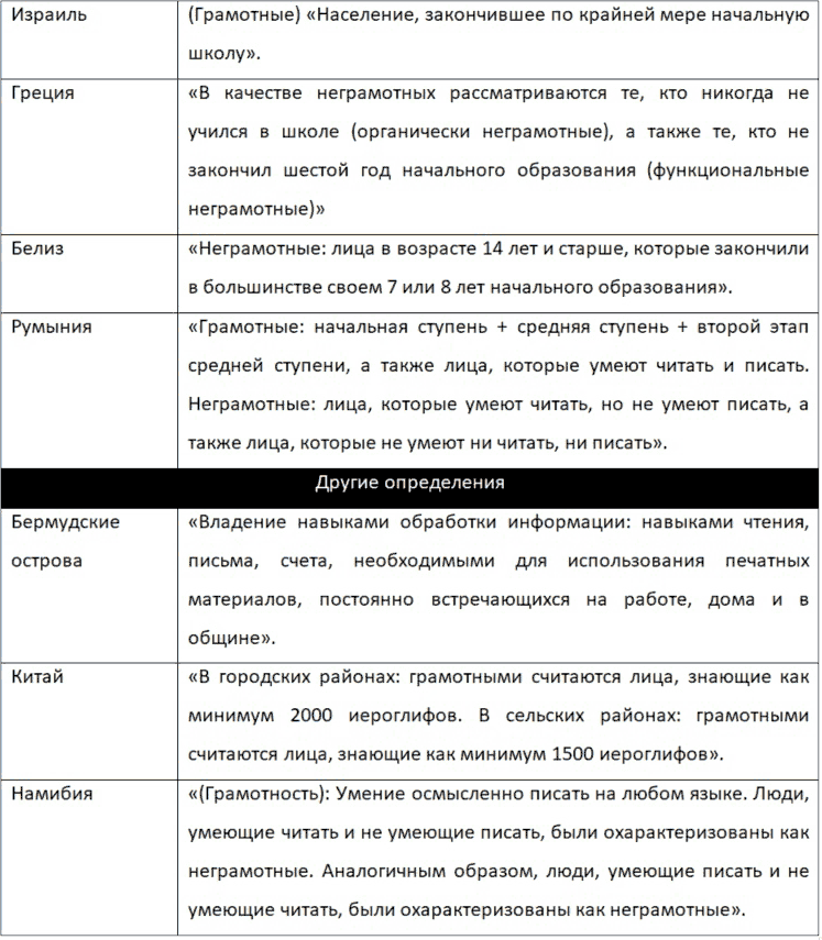Нижеследующая таблица, основывающаяся на данных, составленных Статистическим институтом ЮНЕСКО, показывает национальные определения грамотности, полученные при помощи различных оценочных средств, включая обследования семей и переписи населения, проведенные в 105 различных странах с 1993 года по 2004 год. Около 80 % перечисленных стран определяют грамотность как способность прочитать и/или написать простое предложение на национальном или родном языке.