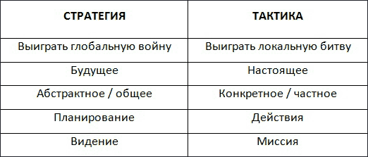 Следующий метафорический образ поможет запомнить разницу между этими двумя понятиями. Ваше желание добраться из одного места в другое определяет общее направление вашего движения. А вот как конкретно вы будите передвигаться – пешком или бегом, приставным шагом или спиной вперёд, с использование мото-велотехники или автомобиля, или ещё как-нибудь, и есть ваши тактические шаги, направленные на достижение стратегической цели: добраться из одного места в другое.