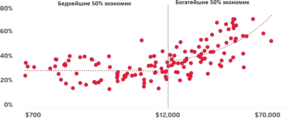 Уровень финансовой грамотности в целом больше у обеспеченных людей, чем у бедных. Также этот уровень растёт с уровнем образования.