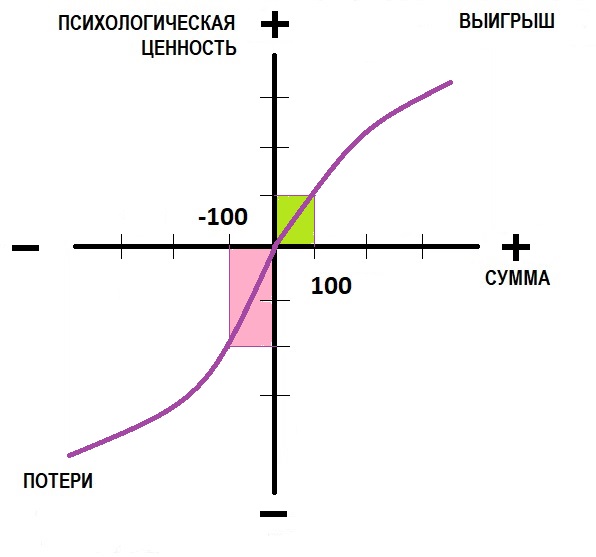 Эти три принципа, можно проиллюстрировать с помощью следующего графика, который показывает психологическую ценность выигрышей и потерь.