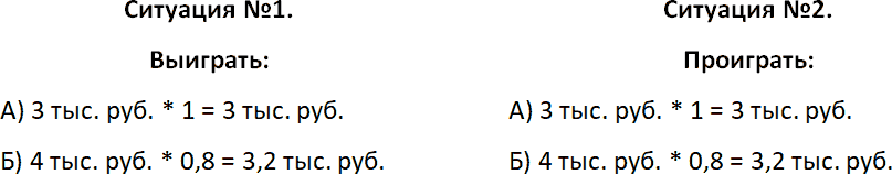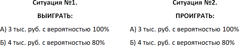 Более 80 % людей в первой ситуации выбирают ответ «А». И более 90 % людей во второй ситуации выбирают ответ «Б». Но если бы люди поступали рационально, тогда в первой ситуации следовало бы выбрать вариант «Б», а во втором – «А».