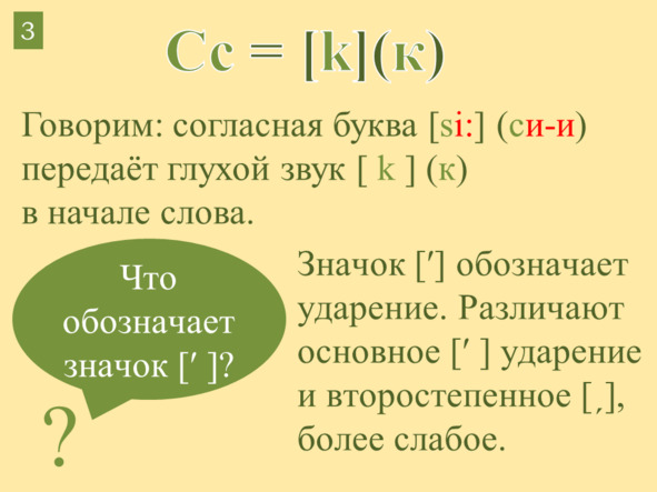 Почему несколько букв вместе поют одну песенку? Некоторые звуки передаются с помощью буквосочетаний. Например: буквосочетание ck (си кэй) передаёт звук [k] (к) в слове Cricket. Запомните: Cс (си) – [k] (к); Kk (кэй) – [k] (к); ck (си кэй) – [k] (к).