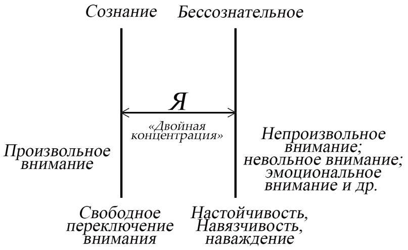 И так, согласно дэусологической концепции можно выделить два основных вида внимания – сознательное и бессознательное (автоматическое). Из общепринятой классификации к сознательному вниманию можно отнести произвольное, к автоматическому – непроизвольное внимание. При этом в общем диапазоне наблюдений непроизвольное внимание является всего лишь частным случаем АВ. К более глубокому «уровню» внимания бессознательного можно отнести, например, невольное и эмоциональное внимание, характеризуемые настойчивостью и навязчивостью.