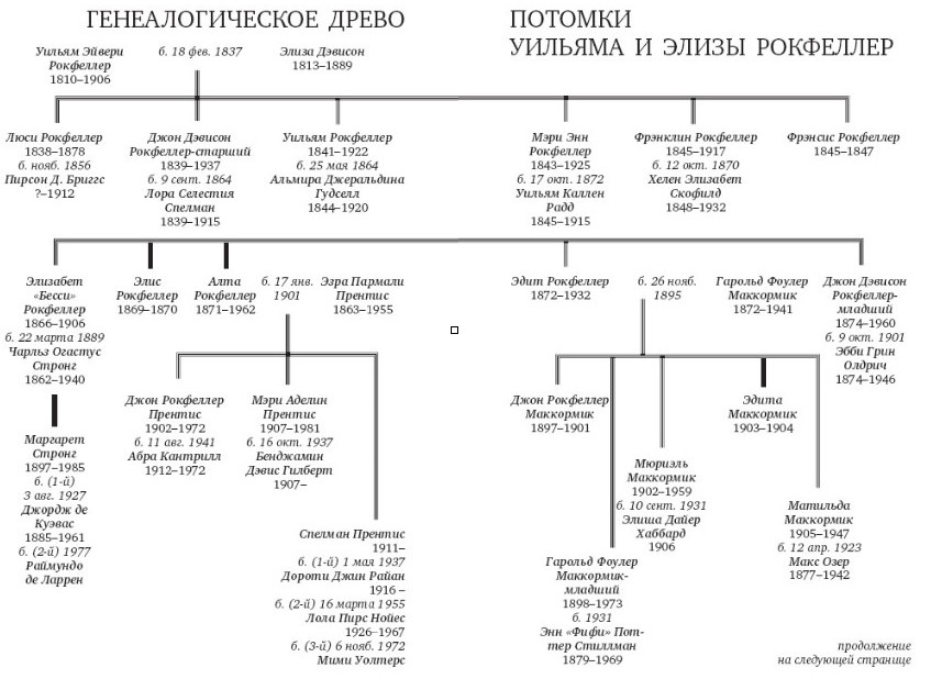 Около 1723 года Иоганн Петер Рокфеллер, мельник, вместе с женой и пятью детьми, приплыл в Филадельфию и осел на ферме в Сомервилле, а затем в Амуэлле, штат Нью-Джерси, где он, судя по всему, начал процветать и приобрел большие земли. Через десять с лишним лет его кузен, Дилл Рокфеллер, перебрался из юго-западной Германии в Джермантаун, штат Нью-Йорк. Внучка Дилла Кристина вышла замуж за своего дальнего родственника Уильяма, внука Иоганна. (Не будучи особо сентиментален по отношению к своим европейским предкам, Джон Д. Рокфеллер все же воздвиг памятник патриарху, Иоганну Петеру, на месте его захоронения во Флемингтоне, штат Нью-Джерси.) В браке Уильяма и Кристины родился сын, Годфри Рокфеллер, дедушка нефтяного титана и человек меньше всего подходящий на роль основателя клана. В 1806 году в Грейт-Баррингтоне, штат Массачусетс, Годфри женился на Люси Эйвери, несмотря на серьезные возражения ее семьи.