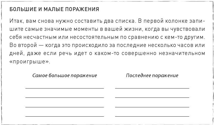 Я был молодым начинающим психологом с горой личных переживаний о собственных профессиональных, социальных и романтических достижениях. Мой пациент сделал мне настоящий подарок. В тот день я понял, что каких бы высот я ни достиг, тенденция сравнивать себя с другими никуда не денется – я просто начну выбирать новых людей, с которыми буду соревноваться. Конечно, мы не будем сравнивать себя с людьми другого с нами ранга или статуса – адвокат никогда не станет профессионально конкурировать с уборщицей, молодая фотомодель не станет соперничать с пожилой женщиной. Мы сравниваем себя с теми, у кого есть немного меньше или больше того, что уже есть у нас. Воображаемые соперники будут меняться, но наше неустанное беспокойство по поводу нашего положения в стае никуда не денется.