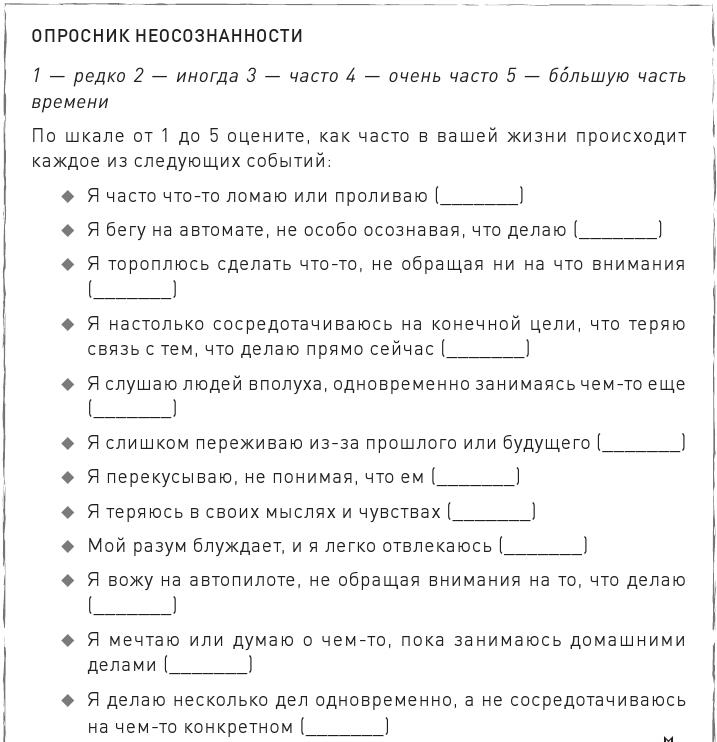 Рабочее определение осознанности, которое я и мои коллеги считаем наиболее полным, – это понимание переживаемого опыта через его принятие. Оно настолько простое, что вы можете подумать: «Эй, я уже осознаю и принимаю свои переживания в моменте». Мы все так думаем, пока не углубимся в наше психическое состояние, которое почти всегда оказывается какими угодно, но только не осознанным. Но исследователи нашли способ надежного измерения нашего уровня осознанности. Вам лишь нужно вспомнить моменты вашей повседневной неосознанности.