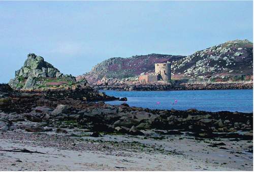 FIG 15. Cromwell’s Castle and the ruins of King Charles’s Castle, Tresco. Photographed from near Hangman’s Island, Bryher, March 2005. (Rosemary Parslow)
