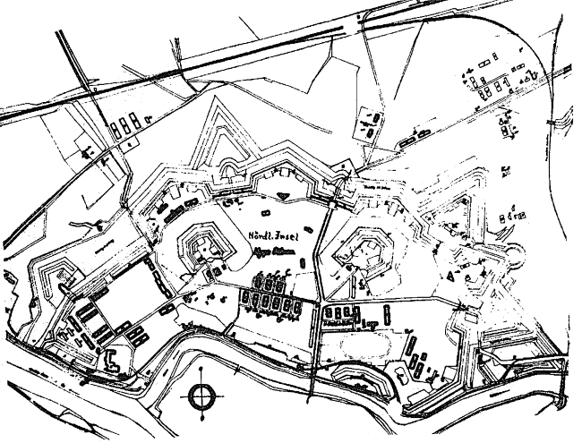 Итак, в центре, на Центральном острове[33], находилась Цитадель, построенная по всему его периметру двухэтажная кирпичная казарма (далее – кольцевая казарма) высотой примерно 11 м, протяженностью 1,8 км. Толщина наружных стен с бойницами достигала 2 метров, внутренних с окнами – до 1,5 м[34]. Кольцевая казарма состояла из 500 казематов – с амбразурами для орудий и стрелкового оружия.