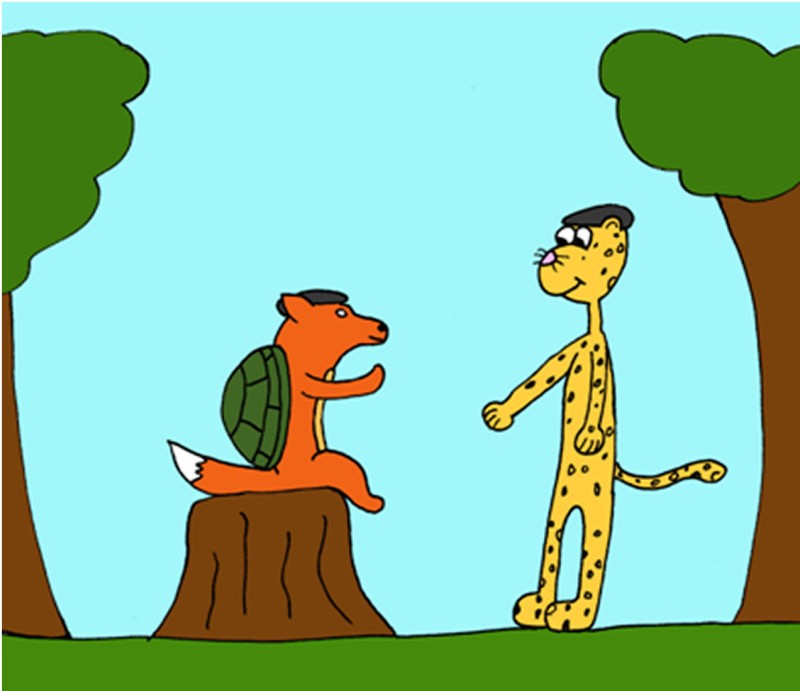 »Mein lieber Freund Leopard, ich will dir einen Gefallen tun, der dich noch berühmter als König Löwe machen wird. Ich werde deine Jungen mit wunderschönen Flecken verzieren, wie sie noch nie jemand gesehen hat. Und wenn ich fertig damit bin sie anzumalen, werden alle Tiere von Dschungelstadt endlich einsehen, dass König Löwe dir nicht ebenbürtig ist. Schließlich werden alle in Dschungelstadt zusammenkommen und dich anstatt dem Löwen zum König machen. Und sie werden vor dir auf die Knie fallen und rufen: ›Heil dir, König Leopard!‹«