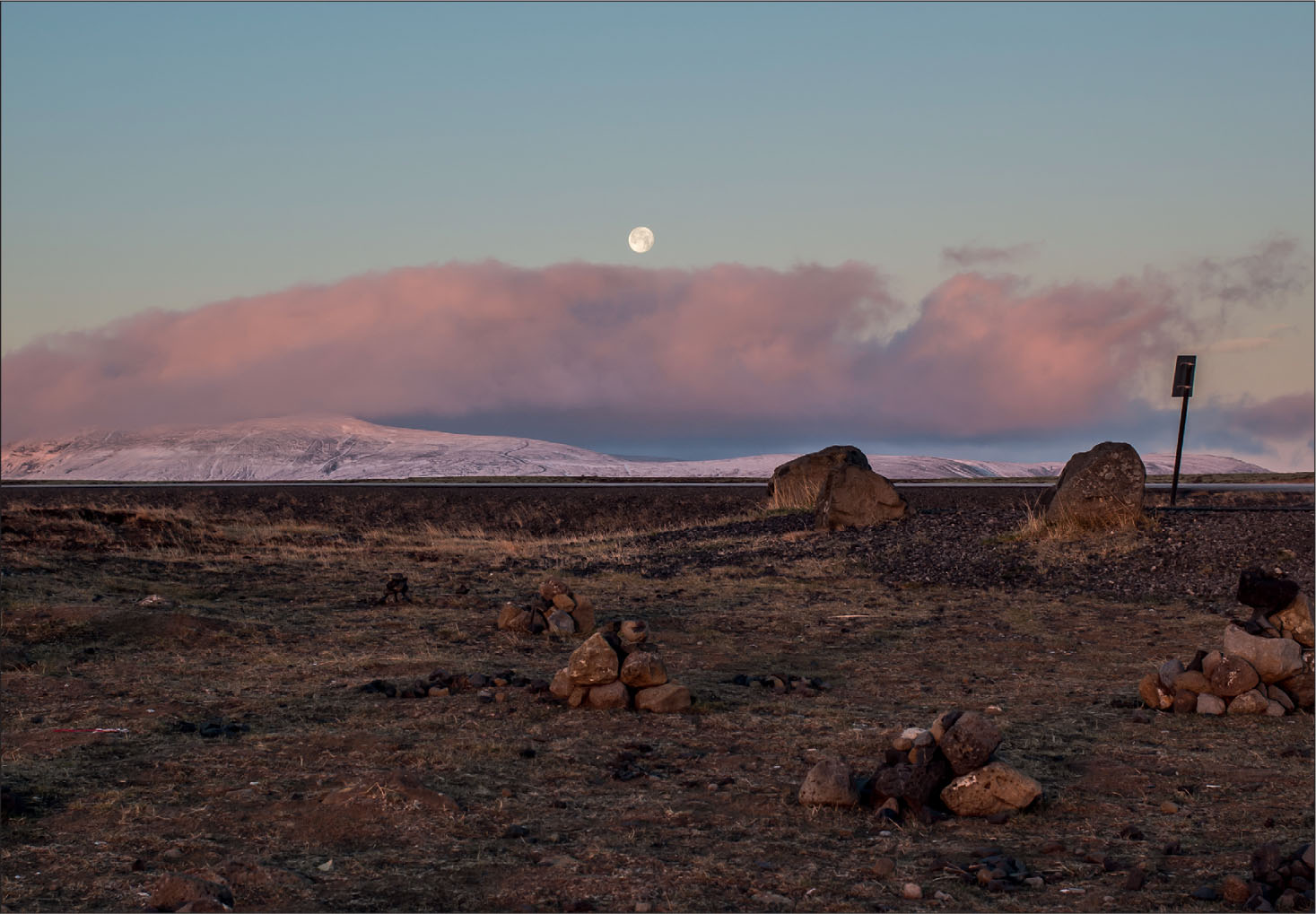 The Moon setting in the morning sky over Icelandic mountains.