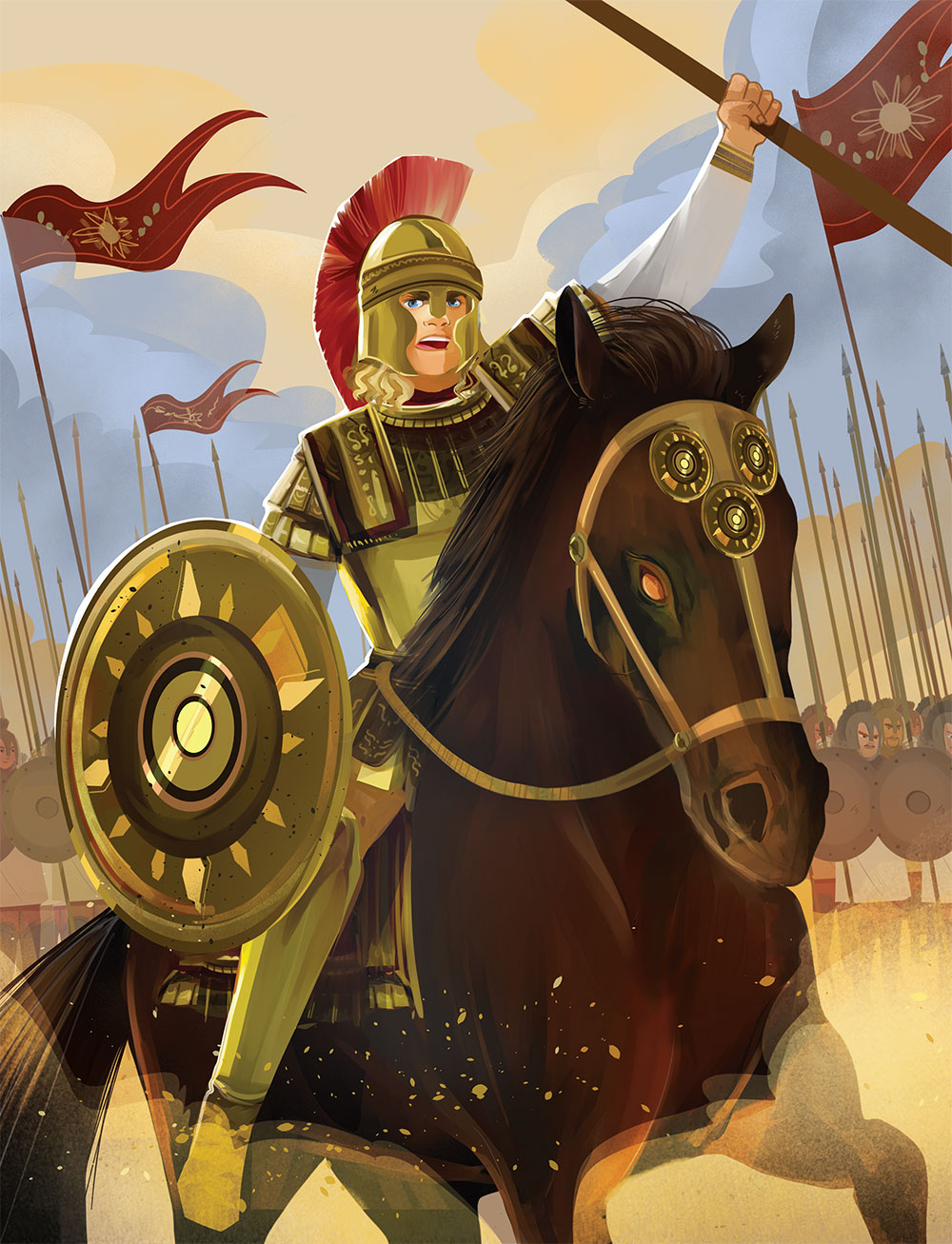 Сначала я не знал, верить ли её словам, но вскоре оказалось, что я и вправду очень способный. Однажды к нам во дворец пришёл торговец лошадьми. Он привёл с собой прекрасного чёрного жеребца – здоровенного, гордого и величественного. Ни у кого не вышло его оседлать. Мой отец уже собирался отказаться от покупки, но тут вмешался я. Хотя мне и было всего 12 лет, я заявил, что смогу приручить коня. Все вокруг смеялись и шептались, но я не обращал на них внимания, а просто подошёл к скакуну и погладил его по морде. Так я и гладил его, пока он не успокоился. Затем, выбрав удачный момент, я решительно вскочил на коня. Тот сразу же покорился и с тех пор не подпускал к себе никого, кроме меня. Я назвал его Буцефалом, и мы стали неразлучны – как в мирное время, так и в бою. А через сколько сражений мы прошли с ним вместе!